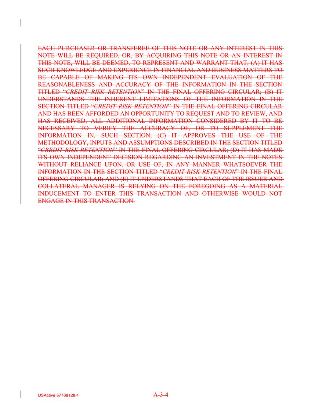 EACH PURCHASER OR TRANSFEREE OF THIS NOTE OR ANY INTEREST IN THIS NOTE WILL BE REQUIRED, OR, BY ACQUIRING THIS NOTE OR AN INTEREST IN THIS NOTE, WILL BE DEEMED, TO REPRESENT AND WARRANT THAT: (A) IT HAS SUCH KNOWLEDGE AND EXPERIENCE IN FINANCIAL AND BUSINESS MATTERS TO BE CAPABLE OF MAKING ITS OWN INDEPENDENT EVALUATION OF THE REASONABLENESS AND ACCURACY OF THE INFORMATION IN THE SECTION TITLED “CREDIT RISK RETENTION” IN THE FINAL OFFERING CIRCULAR; (B) IT UNDERSTANDS THE INHERENT LIMITATIONS OF THE INFORMATION IN THE SECTION TITLED “CREDIT RISK RETENTION” IN THE FINAL OFFERING CIRCULAR AND HAS BEEN AFFORDED AN OPPORTUNITY TO REQUEST AND TO REVIEW, AND HAS RECEIVED, ALL ADDITIONAL INFORMATION CONSIDERED BY IT TO BE NECESSARY TO VERIFY THE ACCURACY OF, OR TO SUPPLEMENT THE INFORMATION IN, SUCH SECTION; (C) IT APPROVES THE USE OF THE METHODOLOGY, INPUTS AND ASSUMPTIONS DESCRIBED IN THE SECTION TITLED “CREDIT RISK RETENTION” IN THE FINAL OFFERING CIRCULAR; (D) IT HAS MADE ITS OWN INDEPENDENT DECISION REGARDING AN INVESTMENT IN THE NOTES WITHOUT RELIANCE UPON, OR USE OF, IN ANY MANNER WHATSOEVER THE INFORMATION IN THE SECTION TITLED “CREDIT RISK RETENTION” IN THE FINAL OFFERING CIRCULAR; AND (E) IT UNDERSTANDS THAT EACH OF THE ISSUER AND COLLATERAL MANAGER IS RELYING ON THE FOREGOING AS A MATERIAL INDUCEMENT TO ENTER THIS TRANSACTION AND OTHERWISE WOULD NOT ENGAGE IN THIS TRANSACTION. USActive 57788128.4 A-3-4