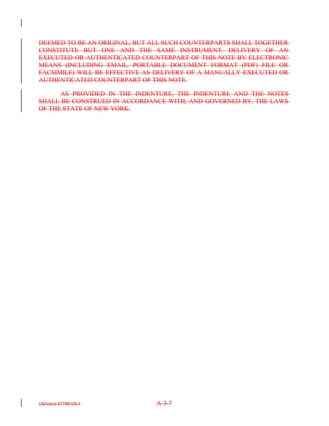 DEEMED TO BE AN ORIGINAL, BUT ALL SUCH COUNTERPARTS SHALL TOGETHER CONSTITUTE BUT ONE AND THE SAME INSTRUMENT. DELIVERY OF AN EXECUTED OR AUTHENTICATED COUNTERPART OF THIS NOTE BY ELECTRONIC MEANS (INCLUDING EMAIL, PORTABLE DOCUMENT FORMAT (PDF) FILE OR FACSIMILE) WILL BE EFFECTIVE AS DELIVERY OF A MANUALLY EXECUTED OR AUTHENTICATED COUNTERPART OF THIS NOTE. AS PROVIDED IN THE INDENTURE, THE INDENTURE AND THE NOTES SHALL BE CONSTRUED IN ACCORDANCE WITH, AND GOVERNED BY, THE LAWS OF THE STATE OF NEW YORK. USActive 57788128.4 A-3-7