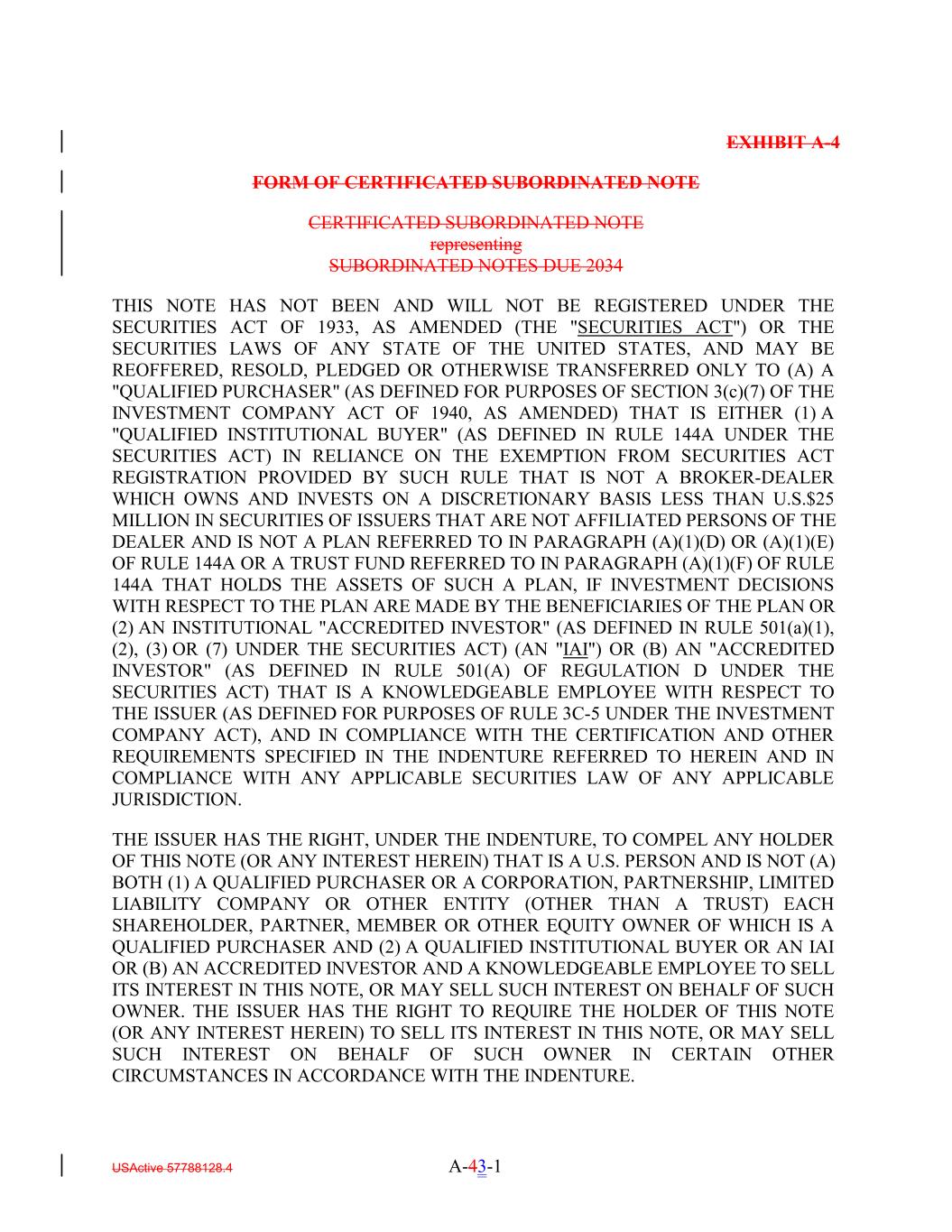 EXHIBIT A-4 FORM OF CERTIFICATED SUBORDINATED NOTE CERTIFICATED SUBORDINATED NOTE representing SUBORDINATED NOTES DUE 2034 THIS NOTE HAS NOT BEEN AND WILL NOT BE REGISTERED UNDER THE SECURITIES ACT OF 1933, AS AMENDED (THE "SECURITIES ACT") OR THE SECURITIES LAWS OF ANY STATE OF THE UNITED STATES, AND MAY BE REOFFERED, RESOLD, PLEDGED OR OTHERWISE TRANSFERRED ONLY TO (A) A "QUALIFIED PURCHASER" (AS DEFINED FOR PURPOSES OF SECTION 3(c)(7) OF THE INVESTMENT COMPANY ACT OF 1940, AS AMENDED) THAT IS EITHER (1) A "QUALIFIED INSTITUTIONAL BUYER" (AS DEFINED IN RULE 144A UNDER THE SECURITIES ACT) IN RELIANCE ON THE EXEMPTION FROM SECURITIES ACT REGISTRATION PROVIDED BY SUCH RULE THAT IS NOT A BROKER-DEALER WHICH OWNS AND INVESTS ON A DISCRETIONARY BASIS LESS THAN U.S.$25 MILLION IN SECURITIES OF ISSUERS THAT ARE NOT AFFILIATED PERSONS OF THE DEALER AND IS NOT A PLAN REFERRED TO IN PARAGRAPH (A)(1)(D) OR (A)(1)(E) OF RULE 144A OR A TRUST FUND REFERRED TO IN PARAGRAPH (A)(1)(F) OF RULE 144A THAT HOLDS THE ASSETS OF SUCH A PLAN, IF INVESTMENT DECISIONS WITH RESPECT TO THE PLAN ARE MADE BY THE BENEFICIARIES OF THE PLAN OR (2) AN INSTITUTIONAL "ACCREDITED INVESTOR" (AS DEFINED IN RULE 501(a)(1), (2), (3) OR (7) UNDER THE SECURITIES ACT) (AN "IAI") OR (B) AN "ACCREDITED INVESTOR" (AS DEFINED IN RULE 501(A) OF REGULATION D UNDER THE SECURITIES ACT) THAT IS A KNOWLEDGEABLE EMPLOYEE WITH RESPECT TO THE ISSUER (AS DEFINED FOR PURPOSES OF RULE 3C-5 UNDER THE INVESTMENT COMPANY ACT), AND IN COMPLIANCE WITH THE CERTIFICATION AND OTHER REQUIREMENTS SPECIFIED IN THE INDENTURE REFERRED TO HEREIN AND IN COMPLIANCE WITH ANY APPLICABLE SECURITIES LAW OF ANY APPLICABLE JURISDICTION. THE ISSUER HAS THE RIGHT, UNDER THE INDENTURE, TO COMPEL ANY HOLDER OF THIS NOTE (OR ANY INTEREST HEREIN) THAT IS A U.S. PERSON AND IS NOT (A) BOTH (1) A QUALIFIED PURCHASER OR A CORPORATION, PARTNERSHIP, LIMITED LIABILITY COMPANY OR OTHER ENTITY (OTHER THAN A TRUST) EACH SHAREHOLDER, PARTNER, MEMBER OR OTHER EQUITY OWNER OF WHICH IS A QUALIFIED PURCHASER AND (2) A QUALIFIED INSTITUTIONAL BUYER OR AN IAI OR (B) AN ACCREDITED INVESTOR AND A KNOWLEDGEABLE EMPLOYEE TO SELL ITS INTEREST IN THIS NOTE, OR MAY SELL SUCH INTEREST ON BEHALF OF SUCH OWNER. THE ISSUER HAS THE RIGHT TO REQUIRE THE HOLDER OF THIS NOTE (OR ANY INTEREST HEREIN) TO SELL ITS INTEREST IN THIS NOTE, OR MAY SELL SUCH INTEREST ON BEHALF OF SUCH OWNER IN CERTAIN OTHER CIRCUMSTANCES IN ACCORDANCE WITH THE INDENTURE. USActive 57788128.4 A-43-1