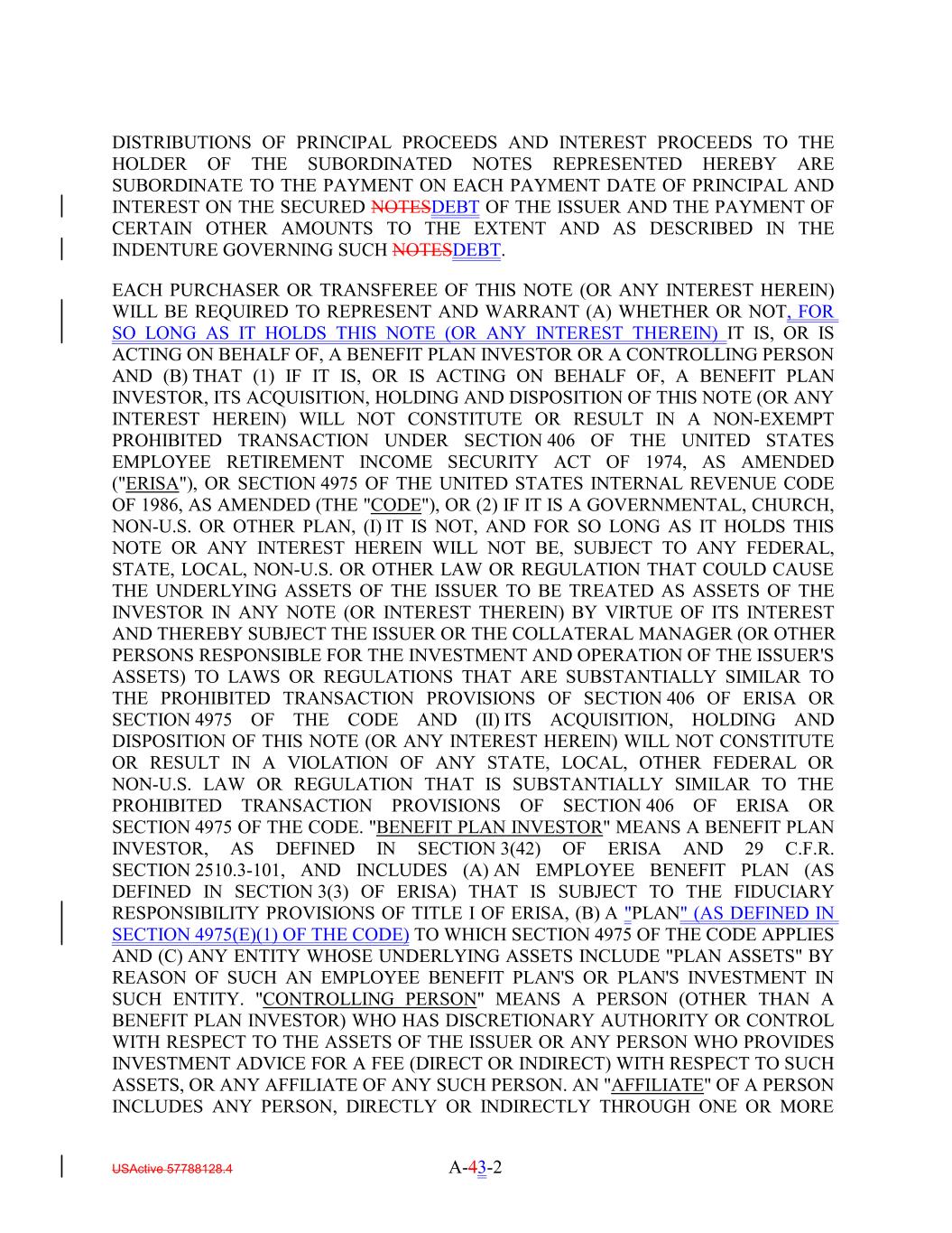 DISTRIBUTIONS OF PRINCIPAL PROCEEDS AND INTEREST PROCEEDS TO THE HOLDER OF THE SUBORDINATED NOTES REPRESENTED HEREBY ARE SUBORDINATE TO THE PAYMENT ON EACH PAYMENT DATE OF PRINCIPAL AND INTEREST ON THE SECURED NOTESDEBT OF THE ISSUER AND THE PAYMENT OF CERTAIN OTHER AMOUNTS TO THE EXTENT AND AS DESCRIBED IN THE INDENTURE GOVERNING SUCH NOTESDEBT. EACH PURCHASER OR TRANSFEREE OF THIS NOTE (OR ANY INTEREST HEREIN) WILL BE REQUIRED TO REPRESENT AND WARRANT (A) WHETHER OR NOT, FOR SO LONG AS IT HOLDS THIS NOTE (OR ANY INTEREST THEREIN) IT IS, OR IS ACTING ON BEHALF OF, A BENEFIT PLAN INVESTOR OR A CONTROLLING PERSON AND (B) THAT (1) IF IT IS, OR IS ACTING ON BEHALF OF, A BENEFIT PLAN INVESTOR, ITS ACQUISITION, HOLDING AND DISPOSITION OF THIS NOTE (OR ANY INTEREST HEREIN) WILL NOT CONSTITUTE OR RESULT IN A NON-EXEMPT PROHIBITED TRANSACTION UNDER SECTION 406 OF THE UNITED STATES EMPLOYEE RETIREMENT INCOME SECURITY ACT OF 1974, AS AMENDED ("ERISA"), OR SECTION 4975 OF THE UNITED STATES INTERNAL REVENUE CODE OF 1986, AS AMENDED (THE "CODE"), OR (2) IF IT IS A GOVERNMENTAL, CHURCH, NON-U.S. OR OTHER PLAN, (I) IT IS NOT, AND FOR SO LONG AS IT HOLDS THIS NOTE OR ANY INTEREST HEREIN WILL NOT BE, SUBJECT TO ANY FEDERAL, STATE, LOCAL, NON-U.S. OR OTHER LAW OR REGULATION THAT COULD CAUSE THE UNDERLYING ASSETS OF THE ISSUER TO BE TREATED AS ASSETS OF THE INVESTOR IN ANY NOTE (OR INTEREST THEREIN) BY VIRTUE OF ITS INTEREST AND THEREBY SUBJECT THE ISSUER OR THE COLLATERAL MANAGER (OR OTHER PERSONS RESPONSIBLE FOR THE INVESTMENT AND OPERATION OF THE ISSUER'S ASSETS) TO LAWS OR REGULATIONS THAT ARE SUBSTANTIALLY SIMILAR TO THE PROHIBITED TRANSACTION PROVISIONS OF SECTION 406 OF ERISA OR SECTION 4975 OF THE CODE AND (II) ITS ACQUISITION, HOLDING AND DISPOSITION OF THIS NOTE (OR ANY INTEREST HEREIN) WILL NOT CONSTITUTE OR RESULT IN A VIOLATION OF ANY STATE, LOCAL, OTHER FEDERAL OR NON-U.S. LAW OR REGULATION THAT IS SUBSTANTIALLY SIMILAR TO THE PROHIBITED TRANSACTION PROVISIONS OF SECTION 406 OF ERISA OR SECTION 4975 OF THE CODE. "BENEFIT PLAN INVESTOR" MEANS A BENEFIT PLAN INVESTOR, AS DEFINED IN SECTION 3(42) OF ERISA AND 29 C.F.R. SECTION 2510.3-101, AND INCLUDES (A) AN EMPLOYEE BENEFIT PLAN (AS DEFINED IN SECTION 3(3) OF ERISA) THAT IS SUBJECT TO THE FIDUCIARY RESPONSIBILITY PROVISIONS OF TITLE I OF ERISA, (B) A "PLAN" (AS DEFINED IN SECTION 4975(E)(1) OF THE CODE) TO WHICH SECTION 4975 OF THE CODE APPLIES AND (C) ANY ENTITY WHOSE UNDERLYING ASSETS INCLUDE "PLAN ASSETS" BY REASON OF SUCH AN EMPLOYEE BENEFIT PLAN'S OR PLAN'S INVESTMENT IN SUCH ENTITY. "CONTROLLING PERSON" MEANS A PERSON (OTHER THAN A BENEFIT PLAN INVESTOR) WHO HAS DISCRETIONARY AUTHORITY OR CONTROL WITH RESPECT TO THE ASSETS OF THE ISSUER OR ANY PERSON WHO PROVIDES INVESTMENT ADVICE FOR A FEE (DIRECT OR INDIRECT) WITH RESPECT TO SUCH ASSETS, OR ANY AFFILIATE OF ANY SUCH PERSON. AN "AFFILIATE" OF A PERSON INCLUDES ANY PERSON, DIRECTLY OR INDIRECTLY THROUGH ONE OR MORE USActive 57788128.4 A-43-2