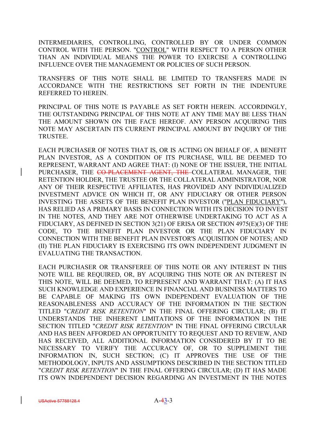 INTERMEDIARIES, CONTROLLING, CONTROLLED BY OR UNDER COMMON CONTROL WITH THE PERSON. "CONTROL" WITH RESPECT TO A PERSON OTHER THAN AN INDIVIDUAL MEANS THE POWER TO EXERCISE A CONTROLLING INFLUENCE OVER THE MANAGEMENT OR POLICIES OF SUCH PERSON. TRANSFERS OF THIS NOTE SHALL BE LIMITED TO TRANSFERS MADE IN ACCORDANCE WITH THE RESTRICTIONS SET FORTH IN THE INDENTURE REFERRED TO HEREIN. PRINCIPAL OF THIS NOTE IS PAYABLE AS SET FORTH HEREIN. ACCORDINGLY, THE OUTSTANDING PRINCIPAL OF THIS NOTE AT ANY TIME MAY BE LESS THAN THE AMOUNT SHOWN ON THE FACE HEREOF. ANY PERSON ACQUIRING THIS NOTE MAY ASCERTAIN ITS CURRENT PRINCIPAL AMOUNT BY INQUIRY OF THE TRUSTEE. EACH PURCHASER OF NOTES THAT IS, OR IS ACTING ON BEHALF OF, A BENEFIT PLAN INVESTOR, AS A CONDITION OF ITS PURCHASE, WILL BE DEEMED TO REPRESENT, WARRANT AND AGREE THAT: (I) NONE OF THE ISSUER, THE INITIAL PURCHASER, THE CO-PLACEMENT AGENT, THE COLLATERAL MANAGER, THE RETENTION HOLDER, THE TRUSTEE OR THE COLLATERAL ADMINISTRATOR, NOR ANY OF THEIR RESPECTIVE AFFILIATES, HAS PROVIDED ANY INDIVIDUALIZED INVESTMENT ADVICE ON WHICH IT, OR ANY FIDUCIARY OR OTHER PERSON INVESTING THE ASSETS OF THE BENEFIT PLAN INVESTOR ("PLAN FIDUCIARY"), HAS RELIED AS A PRIMARY BASIS IN CONNECTION WITH ITS DECISION TO INVEST IN THE NOTES, AND THEY ARE NOT OTHERWISE UNDERTAKING TO ACT AS A FIDUCIARY, AS DEFINED IN SECTION 3(21) OF ERISA OR SECTION 4975(E)(3) OF THE CODE, TO THE BENEFIT PLAN INVESTOR OR THE PLAN FIDUCIARY IN CONNECTION WITH THE BENEFIT PLAN INVESTOR'S ACQUISITION OF NOTES; AND (II) THE PLAN FIDUCIARY IS EXERCISING ITS OWN INDEPENDENT JUDGMENT IN EVALUATING THE TRANSACTION. EACH PURCHASER OR TRANSFEREE OF THIS NOTE OR ANY INTEREST IN THIS NOTE WILL BE REQUIRED, OR, BY ACQUIRING THIS NOTE OR AN INTEREST IN THIS NOTE, WILL BE DEEMED, TO REPRESENT AND WARRANT THAT: (A) IT HAS SUCH KNOWLEDGE AND EXPERIENCE IN FINANCIAL AND BUSINESS MATTERS TO BE CAPABLE OF MAKING ITS OWN INDEPENDENT EVALUATION OF THE REASONABLENESS AND ACCURACY OF THE INFORMATION IN THE SECTION TITLED "CREDIT RISK RETENTION" IN THE FINAL OFFERING CIRCULAR; (B) IT UNDERSTANDS THE INHERENT LIMITATIONS OF THE INFORMATION IN THE SECTION TITLED "CREDIT RISK RETENTION" IN THE FINAL OFFERING CIRCULAR AND HAS BEEN AFFORDED AN OPPORTUNITY TO REQUEST AND TO REVIEW, AND HAS RECEIVED, ALL ADDITIONAL INFORMATION CONSIDERED BY IT TO BE NECESSARY TO VERIFY THE ACCURACY OF, OR TO SUPPLEMENT THE INFORMATION IN, SUCH SECTION; (C) IT APPROVES THE USE OF THE METHODOLOGY, INPUTS AND ASSUMPTIONS DESCRIBED IN THE SECTION TITLED "CREDIT RISK RETENTION" IN THE FINAL OFFERING CIRCULAR; (D) IT HAS MADE ITS OWN INDEPENDENT DECISION REGARDING AN INVESTMENT IN THE NOTES USActive 57788128.4 A-43-3
