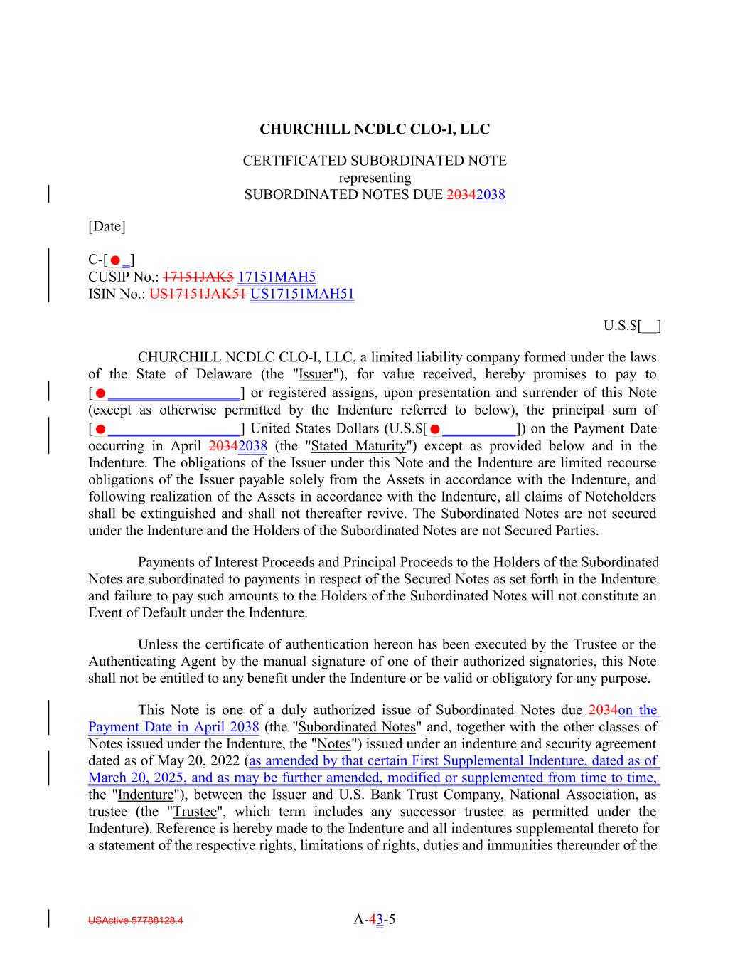 CHURCHILL NCDLC CLO-I, LLC CERTIFICATED SUBORDINATED NOTE representing SUBORDINATED NOTES DUE 20342038 [Date] C-[_] CUSIP No.: 17151JAK5 17151MAH5 ISIN No.: US17151JAK51 US17151MAH51 U.S.$[__] CHURCHILL NCDLC CLO-I, LLC, a limited liability company formed under the laws of the State of Delaware (the "Issuer"), for value received, hereby promises to pay to [__________________] or registered assigns, upon presentation and surrender of this Note (except as otherwise permitted by the Indenture referred to below), the principal sum of [__________________] United States Dollars (U.S.$[__________]) on the Payment Date occurring in April 20342038 (the "Stated Maturity") except as provided below and in the Indenture. The obligations of the Issuer under this Note and the Indenture are limited recourse obligations of the Issuer payable solely from the Assets in accordance with the Indenture, and following realization of the Assets in accordance with the Indenture, all claims of Noteholders shall be extinguished and shall not thereafter revive. The Subordinated Notes are not secured under the Indenture and the Holders of the Subordinated Notes are not Secured Parties. Payments of Interest Proceeds and Principal Proceeds to the Holders of the Subordinated Notes are subordinated to payments in respect of the Secured Notes as set forth in the Indenture and failure to pay such amounts to the Holders of the Subordinated Notes will not constitute an Event of Default under the Indenture. Unless the certificate of authentication hereon has been executed by the Trustee or the Authenticating Agent by the manual signature of one of their authorized signatories, this Note shall not be entitled to any benefit under the Indenture or be valid or obligatory for any purpose. This Note is one of a duly authorized issue of Subordinated Notes due 2034on the Payment Date in April 2038 (the "Subordinated Notes" and, together with the other classes of Notes issued under the Indenture, the "Notes") issued under an indenture and security agreement dated as of May 20, 2022 (as amended by that certain First Supplemental Indenture, dated as of March 20, 2025, and as may be further amended, modified or supplemented from time to time, the "Indenture"), between the Issuer and U.S. Bank Trust Company, National Association, as trustee (the "Trustee", which term includes any successor trustee as permitted under the Indenture). Reference is hereby made to the Indenture and all indentures supplemental thereto for a statement of the respective rights, limitations of rights, duties and immunities thereunder of the USActive 57788128.4 A-43-5