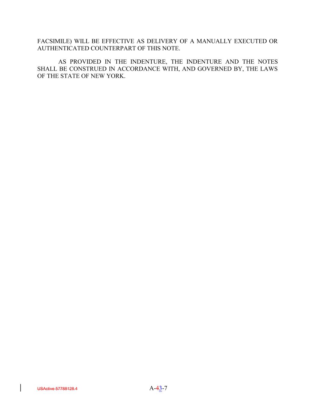 FACSIMILE) WILL BE EFFECTIVE AS DELIVERY OF A MANUALLY EXECUTED OR AUTHENTICATED COUNTERPART OF THIS NOTE. AS PROVIDED IN THE INDENTURE, THE INDENTURE AND THE NOTES SHALL BE CONSTRUED IN ACCORDANCE WITH, AND GOVERNED BY, THE LAWS OF THE STATE OF NEW YORK. USActive 57788128.4 A-43-7