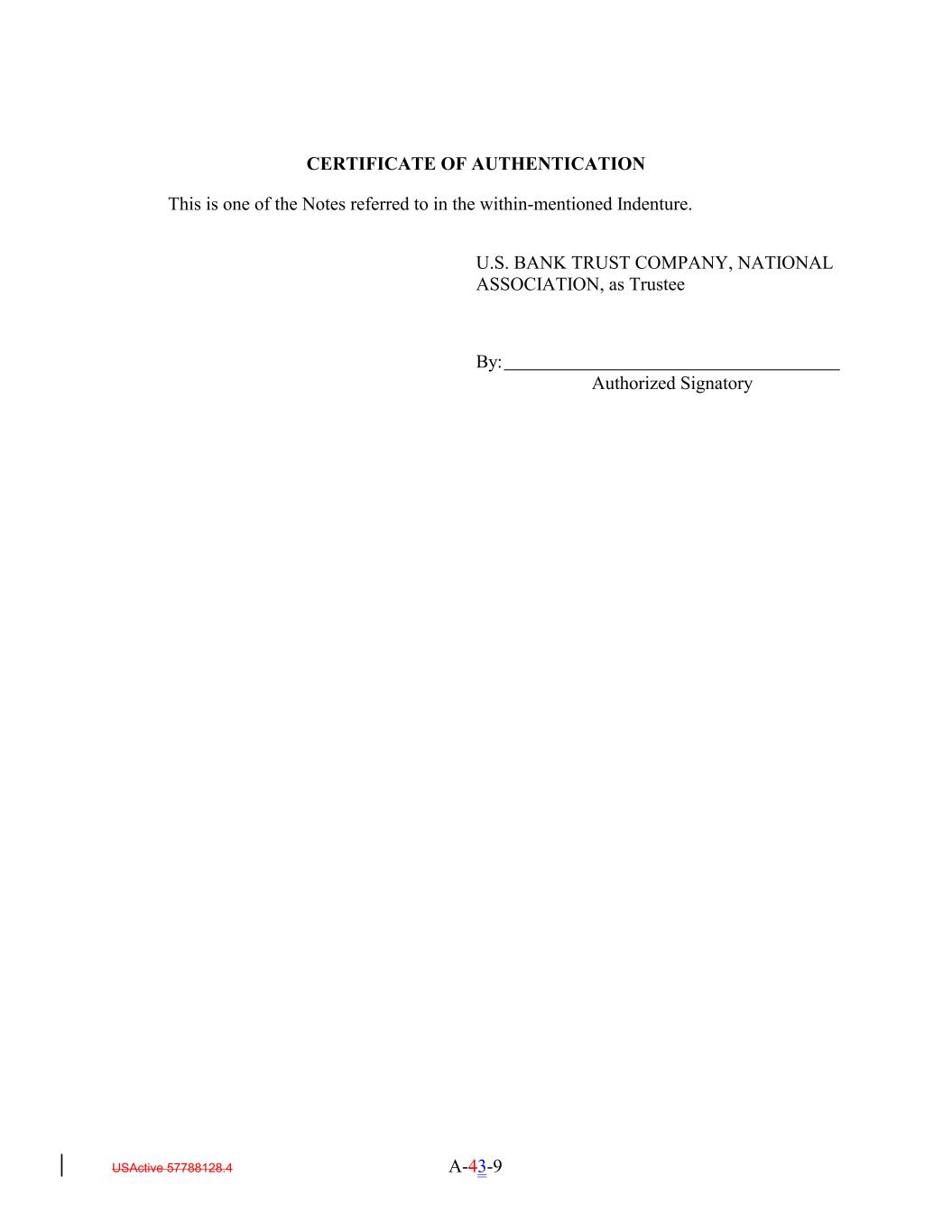 CERTIFICATE OF AUTHENTICATION This is one of the Notes referred to in the within-mentioned Indenture. U.S. BANK TRUST COMPANY, NATIONAL ASSOCIATION, as Trustee By: Authorized Signatory USActive 57788128.4 A-43-9