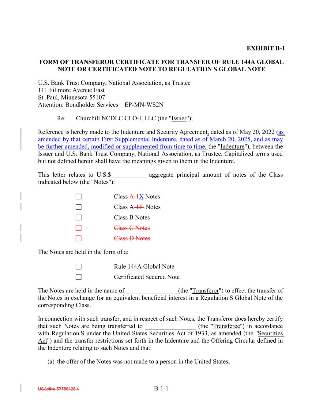 EXHIBIT B-1 FORM OF TRANSFEROR CERTIFICATE FOR TRANSFER OF RULE 144A GLOBAL NOTE OR CERTIFICATED NOTE TO REGULATION S GLOBAL NOTE U.S. Bank Trust Company, National Association, as Trustee 111 Fillmore Avenue East St. Paul, Minnesota 55107 Attention: Bondholder Services – EP-MN-WS2N Re: Churchill NCDLC CLO-I, LLC (the "Issuer"); Reference is hereby made to the Indenture and Security Agreement, dated as of May 20, 2022 (as amended by that certain First Supplemental Indenture, dated as of March 20, 2025, and as may be further amended, modified or supplemented from time to time, the "Indenture"), between the Issuer and U.S. Bank Trust Company, National Association, as Trustee. Capitalized terms used but not defined herein shall have the meanings given to them in the Indenture. This letter relates to U.S.$___________ aggregate principal amount of notes of the Class indicated below (the "Notes"): Class A-1X Notes Class A-1F Notes Class B Notes Class C Notes Class D Notes The Notes are held in the form of a: Rule 144A Global Note Certificated Secured Note The Notes are held in the name of ________________ (the "Transferor") to effect the transfer of the Notes in exchange for an equivalent beneficial interest in a Regulation S Global Note of the corresponding Class. In connection with such transfer, and in respect of such Notes, the Transferor does hereby certify that such Notes are being transferred to ________________ (the "Transferee") in accordance with Regulation S under the United States Securities Act of 1933, as amended (the "Securities Act") and the transfer restrictions set forth in the Indenture and the Offering Circular defined in the Indenture relating to such Notes and that: (a) the offer of the Notes was not made to a person in the United States; USActive 57788128.4 B-1-1