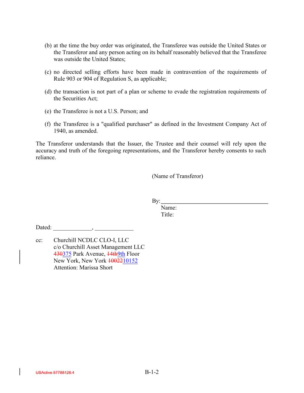 (b) at the time the buy order was originated, the Transferee was outside the United States or the Transferor and any person acting on its behalf reasonably believed that the Transferee was outside the United States; (c) no directed selling efforts have been made in contravention of the requirements of Rule 903 or 904 of Regulation S, as applicable; (d) the transaction is not part of a plan or scheme to evade the registration requirements of the Securities Act; (e) the Transferee is not a U.S. Person; and (f) the Transferee is a "qualified purchaser" as defined in the Investment Company Act of 1940, as amended. The Transferor understands that the Issuer, the Trustee and their counsel will rely upon the accuracy and truth of the foregoing representations, and the Transferor hereby consents to such reliance. (Name of Transferor) By: Name: Title: Dated: _____________, _____________ cc: Churchill NCDLC CLO-I, LLC c/o Churchill Asset Management LLC 430375 Park Avenue, 14th9th Floor New York, New York 1002210152 Attention: Marissa Short USActive 57788128.4 B-1-2