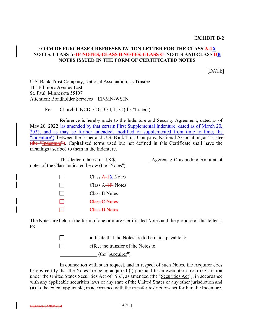 EXHIBIT B-2 FORM OF PURCHASER REPRESENTATION LETTER FOR THE CLASS A-1X NOTES, CLASS A-1F NOTES, CLASS B NOTES, CLASS C NOTES AND CLASS DB NOTES ISSUED IN THE FORM OF CERTIFICATED NOTES [DATE] U.S. Bank Trust Company, National Association, as Trustee 111 Fillmore Avenue East St. Paul, Minnesota 55107 Attention: Bondholder Services – EP-MN-WS2N Re: Churchill NCDLC CLO-I, LLC (the "Issuer") Reference is hereby made to the Indenture and Security Agreement, dated as of May 20, 2022 (as amended by that certain First Supplemental Indenture, dated as of March 20, 2025, and as may be further amended, modified or supplemented from time to time, the "Indenture"), between the Issuer and U.S. Bank Trust Company, National Association, as Trustee (the “Indenture”). Capitalized terms used but not defined in this Certificate shall have the meanings ascribed to them in the Indenture. This letter relates to U.S.$______________ Aggregate Outstanding Amount of notes of the Class indicated below (the "Notes"): Class A-1X Notes Class A-1F Notes Class B Notes Class C Notes Class D Notes The Notes are held in the form of one or more Certificated Notes and the purpose of this letter is to: indicate that the Notes are to be made payable to effect the transfer of the Notes to _______________ (the "Acquirer"). In connection with such request, and in respect of such Notes, the Acquirer does hereby certify that the Notes are being acquired (i) pursuant to an exemption from registration under the United States Securities Act of 1933, as amended (the "Securities Act"), in accordance with any applicable securities laws of any state of the United States or any other jurisdiction and (ii) to the extent applicable, in accordance with the transfer restrictions set forth in the Indenture. USActive 57788128.4 B-2-1