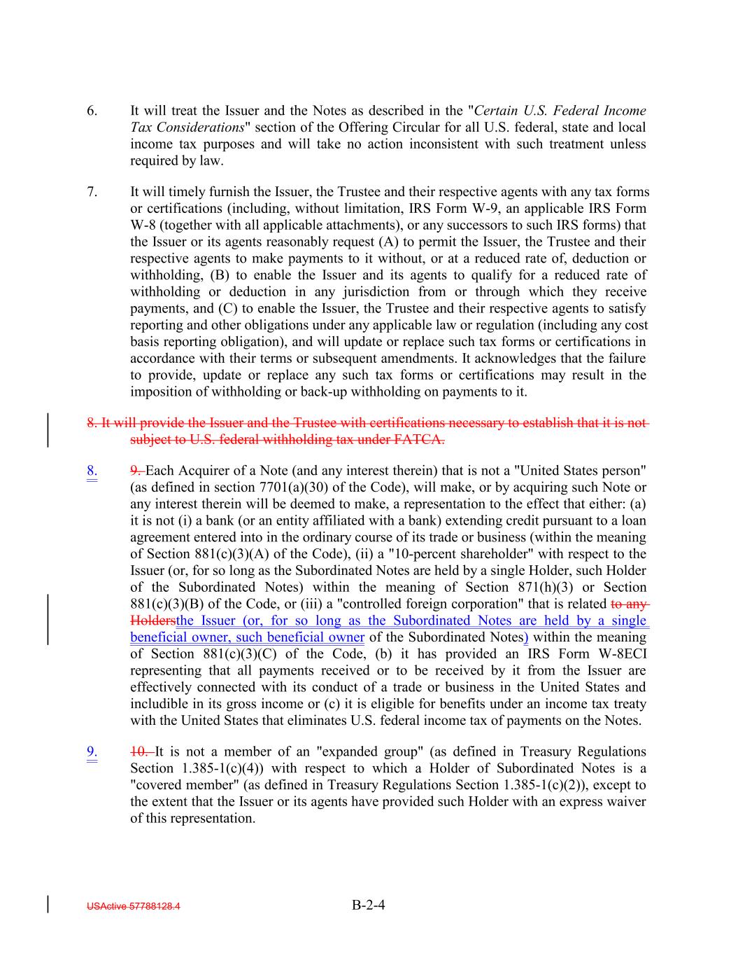 6. It will treat the Issuer and the Notes as described in the "Certain U.S. Federal Income Tax Considerations" section of the Offering Circular for all U.S. federal, state and local income tax purposes and will take no action inconsistent with such treatment unless required by law. 7. It will timely furnish the Issuer, the Trustee and their respective agents with any tax forms or certifications (including, without limitation, IRS Form W-9, an applicable IRS Form W-8 (together with all applicable attachments), or any successors to such IRS forms) that the Issuer or its agents reasonably request (A) to permit the Issuer, the Trustee and their respective agents to make payments to it without, or at a reduced rate of, deduction or withholding, (B) to enable the Issuer and its agents to qualify for a reduced rate of withholding or deduction in any jurisdiction from or through which they receive payments, and (C) to enable the Issuer, the Trustee and their respective agents to satisfy reporting and other obligations under any applicable law or regulation (including any cost basis reporting obligation), and will update or replace such tax forms or certifications in accordance with their terms or subsequent amendments. It acknowledges that the failure to provide, update or replace any such tax forms or certifications may result in the imposition of withholding or back-up withholding on payments to it. 8. It will provide the Issuer and the Trustee with certifications necessary to establish that it is not subject to U.S. federal withholding tax under FATCA. 8. 9. Each Acquirer of a Note (and any interest therein) that is not a "United States person" (as defined in section 7701(a)(30) of the Code), will make, or by acquiring such Note or any interest therein will be deemed to make, a representation to the effect that either: (a) it is not (i) a bank (or an entity affiliated with a bank) extending credit pursuant to a loan agreement entered into in the ordinary course of its trade or business (within the meaning of Section 881(c)(3)(A) of the Code), (ii) a "10-percent shareholder" with respect to the Issuer (or, for so long as the Subordinated Notes are held by a single Holder, such Holder of the Subordinated Notes) within the meaning of Section 871(h)(3) or Section 881(c)(3)(B) of the Code, or (iii) a "controlled foreign corporation" that is related to any Holdersthe Issuer (or, for so long as the Subordinated Notes are held by a single beneficial owner, such beneficial owner of the Subordinated Notes) within the meaning of Section 881(c)(3)(C) of the Code, (b) it has provided an IRS Form W-8ECI representing that all payments received or to be received by it from the Issuer are effectively connected with its conduct of a trade or business in the United States and includible in its gross income or (c) it is eligible for benefits under an income tax treaty with the United States that eliminates U.S. federal income tax of payments on the Notes. 9. 10. It is not a member of an "expanded group" (as defined in Treasury Regulations Section 1.385-1(c)(4)) with respect to which a Holder of Subordinated Notes is a "covered member" (as defined in Treasury Regulations Section 1.385-1(c)(2)), except to the extent that the Issuer or its agents have provided such Holder with an express waiver of this representation. USActive 57788128.4 B-2-4