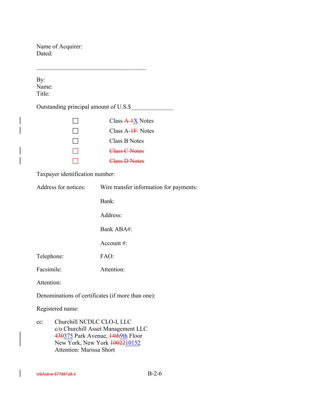 Name of Acquirer: Dated: ____________________________________ By: Name: Title: Outstanding principal amount of U.S.$______________ Class A-1X Notes Class A-1F Notes Class B Notes Class C Notes Class D Notes Taxpayer identification number: Address for notices: Wire transfer information for payments: Bank: Address: Bank ABA#: Account #: Telephone: FAO: Facsimile: Attention: Attention: Denominations of certificates (if more than one): Registered name: cc: Churchill NCDLC CLO-I, LLC c/o Churchill Asset Management LLC 430375 Park Avenue, 14th9th Floor New York, New York 1002210152 Attention: Marissa Short USActive 57788128.4 B-2-6