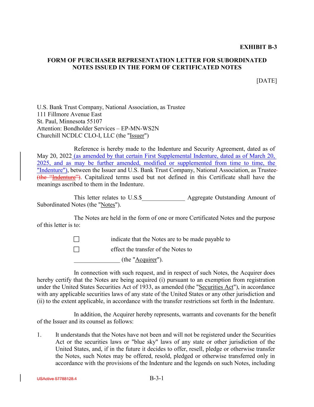 EXHIBIT B-3 FORM OF PURCHASER REPRESENTATION LETTER FOR SUBORDINATED NOTES ISSUED IN THE FORM OF CERTIFICATED NOTES [DATE] U.S. Bank Trust Company, National Association, as Trustee 111 Fillmore Avenue East St. Paul, Minnesota 55107 Attention: Bondholder Services – EP-MN-WS2N Churchill NCDLC CLO-I, LLC (the "Issuer") Reference is hereby made to the Indenture and Security Agreement, dated as of May 20, 2022 (as amended by that certain First Supplemental Indenture, dated as of March 20, 2025, and as may be further amended, modified or supplemented from time to time, the "Indenture"), between the Issuer and U.S. Bank Trust Company, National Association, as Trustee (the “Indenture”). Capitalized terms used but not defined in this Certificate shall have the meanings ascribed to them in the Indenture. This letter relates to U.S.$______________ Aggregate Outstanding Amount of Subordinated Notes (the "Notes"). The Notes are held in the form of one or more Certificated Notes and the purpose of this letter is to: indicate that the Notes are to be made payable to effect the transfer of the Notes to _______________ (the "Acquirer"). In connection with such request, and in respect of such Notes, the Acquirer does hereby certify that the Notes are being acquired (i) pursuant to an exemption from registration under the United States Securities Act of 1933, as amended (the "Securities Act"), in accordance with any applicable securities laws of any state of the United States or any other jurisdiction and (ii) to the extent applicable, in accordance with the transfer restrictions set forth in the Indenture. In addition, the Acquirer hereby represents, warrants and covenants for the benefit of the Issuer and its counsel as follows: 1. It understands that the Notes have not been and will not be registered under the Securities Act or the securities laws or "blue sky" laws of any state or other jurisdiction of the United States, and, if in the future it decides to offer, resell, pledge or otherwise transfer the Notes, such Notes may be offered, resold, pledged or otherwise transferred only in accordance with the provisions of the Indenture and the legends on such Notes, including USActive 57788128.4 B-3-1