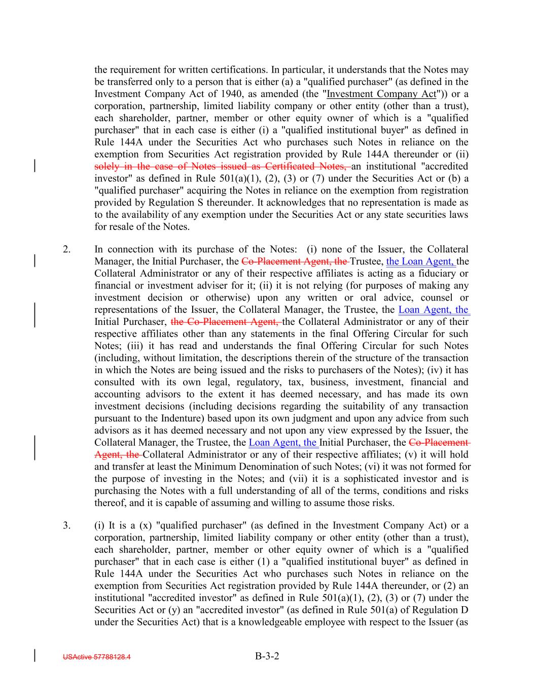 the requirement for written certifications. In particular, it understands that the Notes may be transferred only to a person that is either (a) a "qualified purchaser" (as defined in the Investment Company Act of 1940, as amended (the "Investment Company Act")) or a corporation, partnership, limited liability company or other entity (other than a trust), each shareholder, partner, member or other equity owner of which is a "qualified purchaser" that in each case is either (i) a "qualified institutional buyer" as defined in Rule 144A under the Securities Act who purchases such Notes in reliance on the exemption from Securities Act registration provided by Rule 144A thereunder or (ii) solely in the case of Notes issued as Certificated Notes, an institutional "accredited investor" as defined in Rule 501(a)(1), (2), (3) or (7) under the Securities Act or (b) a "qualified purchaser" acquiring the Notes in reliance on the exemption from registration provided by Regulation S thereunder. It acknowledges that no representation is made as to the availability of any exemption under the Securities Act or any state securities laws for resale of the Notes. 2. In connection with its purchase of the Notes: (i) none of the Issuer, the Collateral Manager, the Initial Purchaser, the Co-Placement Agent, the Trustee, the Loan Agent, the Collateral Administrator or any of their respective affiliates is acting as a fiduciary or financial or investment adviser for it; (ii) it is not relying (for purposes of making any investment decision or otherwise) upon any written or oral advice, counsel or representations of the Issuer, the Collateral Manager, the Trustee, the Loan Agent, the Initial Purchaser, the Co-Placement Agent, the Collateral Administrator or any of their respective affiliates other than any statements in the final Offering Circular for such Notes; (iii) it has read and understands the final Offering Circular for such Notes (including, without limitation, the descriptions therein of the structure of the transaction in which the Notes are being issued and the risks to purchasers of the Notes); (iv) it has consulted with its own legal, regulatory, tax, business, investment, financial and accounting advisors to the extent it has deemed necessary, and has made its own investment decisions (including decisions regarding the suitability of any transaction pursuant to the Indenture) based upon its own judgment and upon any advice from such advisors as it has deemed necessary and not upon any view expressed by the Issuer, the Collateral Manager, the Trustee, the Loan Agent, the Initial Purchaser, the Co-Placement Agent, the Collateral Administrator or any of their respective affiliates; (v) it will hold and transfer at least the Minimum Denomination of such Notes; (vi) it was not formed for the purpose of investing in the Notes; and (vii) it is a sophisticated investor and is purchasing the Notes with a full understanding of all of the terms, conditions and risks thereof, and it is capable of assuming and willing to assume those risks. 3. (i) It is a (x) "qualified purchaser" (as defined in the Investment Company Act) or a corporation, partnership, limited liability company or other entity (other than a trust), each shareholder, partner, member or other equity owner of which is a "qualified purchaser" that in each case is either (1) a "qualified institutional buyer" as defined in Rule 144A under the Securities Act who purchases such Notes in reliance on the exemption from Securities Act registration provided by Rule 144A thereunder, or (2) an institutional "accredited investor" as defined in Rule 501(a)(1), (2), (3) or (7) under the Securities Act or (y) an "accredited investor" (as defined in Rule 501(a) of Regulation D under the Securities Act) that is a knowledgeable employee with respect to the Issuer (as USActive 57788128.4 B-3-2