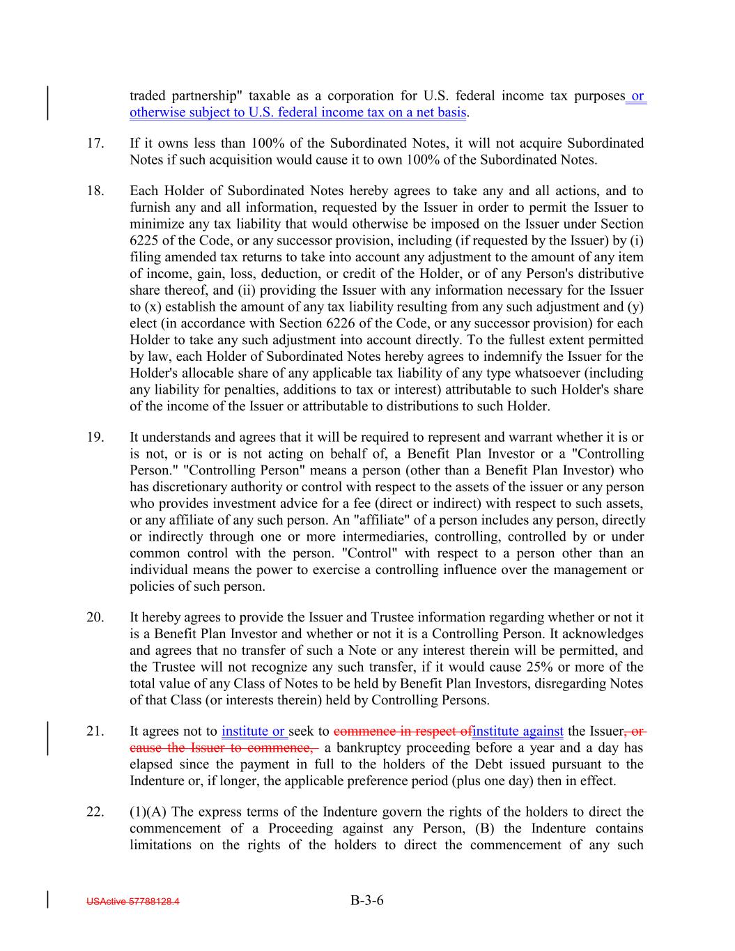 traded partnership" taxable as a corporation for U.S. federal income tax purposes or otherwise subject to U.S. federal income tax on a net basis. 17. If it owns less than 100% of the Subordinated Notes, it will not acquire Subordinated Notes if such acquisition would cause it to own 100% of the Subordinated Notes. 18. Each Holder of Subordinated Notes hereby agrees to take any and all actions, and to furnish any and all information, requested by the Issuer in order to permit the Issuer to minimize any tax liability that would otherwise be imposed on the Issuer under Section 6225 of the Code, or any successor provision, including (if requested by the Issuer) by (i) filing amended tax returns to take into account any adjustment to the amount of any item of income, gain, loss, deduction, or credit of the Holder, or of any Person's distributive share thereof, and (ii) providing the Issuer with any information necessary for the Issuer to (x) establish the amount of any tax liability resulting from any such adjustment and (y) elect (in accordance with Section 6226 of the Code, or any successor provision) for each Holder to take any such adjustment into account directly. To the fullest extent permitted by law, each Holder of Subordinated Notes hereby agrees to indemnify the Issuer for the Holder's allocable share of any applicable tax liability of any type whatsoever (including any liability for penalties, additions to tax or interest) attributable to such Holder's share of the income of the Issuer or attributable to distributions to such Holder. 19. It understands and agrees that it will be required to represent and warrant whether it is or is not, or is or is not acting on behalf of, a Benefit Plan Investor or a "Controlling Person." "Controlling Person" means a person (other than a Benefit Plan Investor) who has discretionary authority or control with respect to the assets of the issuer or any person who provides investment advice for a fee (direct or indirect) with respect to such assets, or any affiliate of any such person. An "affiliate" of a person includes any person, directly or indirectly through one or more intermediaries, controlling, controlled by or under common control with the person. "Control" with respect to a person other than an individual means the power to exercise a controlling influence over the management or policies of such person. 20. It hereby agrees to provide the Issuer and Trustee information regarding whether or not it is a Benefit Plan Investor and whether or not it is a Controlling Person. It acknowledges and agrees that no transfer of such a Note or any interest therein will be permitted, and the Trustee will not recognize any such transfer, if it would cause 25% or more of the total value of any Class of Notes to be held by Benefit Plan Investors, disregarding Notes of that Class (or interests therein) held by Controlling Persons. 21. It agrees not to institute or seek to commence in respect ofinstitute against the Issuer, or cause the Issuer to commence, a bankruptcy proceeding before a year and a day has elapsed since the payment in full to the holders of the Debt issued pursuant to the Indenture or, if longer, the applicable preference period (plus one day) then in effect. 22. (1)(A) The express terms of the Indenture govern the rights of the holders to direct the commencement of a Proceeding against any Person, (B) the Indenture contains limitations on the rights of the holders to direct the commencement of any such USActive 57788128.4 B-3-6