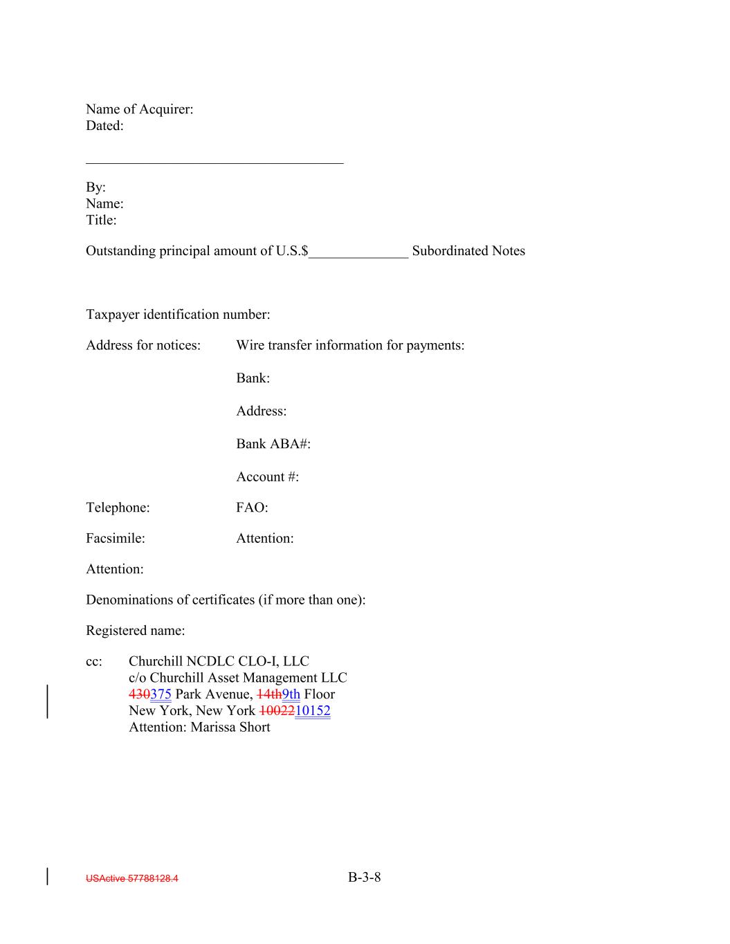 Name of Acquirer: Dated: ____________________________________ By: Name: Title: Outstanding principal amount of U.S.$______________ Subordinated Notes Taxpayer identification number: Address for notices: Wire transfer information for payments: Bank: Address: Bank ABA#: Account #: Telephone: FAO: Facsimile: Attention: Attention: Denominations of certificates (if more than one): Registered name: cc: Churchill NCDLC CLO-I, LLC c/o Churchill Asset Management LLC 430375 Park Avenue, 14th9th Floor New York, New York 1002210152 Attention: Marissa Short USActive 57788128.4 B-3-8