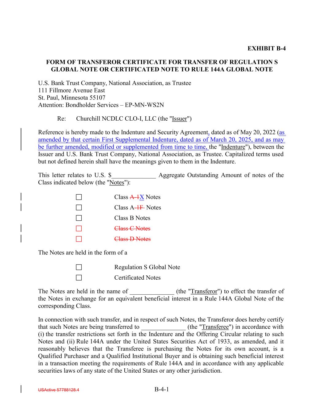 EXHIBIT B-4 FORM OF TRANSFEROR CERTIFICATE FOR TRANSFER OF REGULATION S GLOBAL NOTE OR CERTIFICATED NOTE TO RULE 144A GLOBAL NOTE U.S. Bank Trust Company, National Association, as Trustee 111 Fillmore Avenue East St. Paul, Minnesota 55107 Attention: Bondholder Services – EP-MN-WS2N Re: Churchill NCDLC CLO-I, LLC (the "Issuer") Reference is hereby made to the Indenture and Security Agreement, dated as of May 20, 2022 (as amended by that certain First Supplemental Indenture, dated as of March 20, 2025, and as may be further amended, modified or supplemented from time to time, the "Indenture"), between the Issuer and U.S. Bank Trust Company, National Association, as Trustee. Capitalized terms used but not defined herein shall have the meanings given to them in the Indenture. This letter relates to U.S. $______________ Aggregate Outstanding Amount of notes of the Class indicated below (the "Notes"): Class A-1X Notes Class A-1F Notes Class B Notes Class C Notes Class D Notes The Notes are held in the form of a Regulation S Global Note Certificated Notes The Notes are held in the name of ______________ (the "Transferor") to effect the transfer of the Notes in exchange for an equivalent beneficial interest in a Rule 144A Global Note of the corresponding Class. In connection with such transfer, and in respect of such Notes, the Transferor does hereby certify that such Notes are being transferred to ______________ (the "Transferee") in accordance with (i) the transfer restrictions set forth in the Indenture and the Offering Circular relating to such Notes and (ii) Rule 144A under the United States Securities Act of 1933, as amended, and it reasonably believes that the Transferee is purchasing the Notes for its own account, is a Qualified Purchaser and a Qualified Institutional Buyer and is obtaining such beneficial interest in a transaction meeting the requirements of Rule 144A and in accordance with any applicable securities laws of any state of the United States or any other jurisdiction. USActive 57788128.4 B-4-1