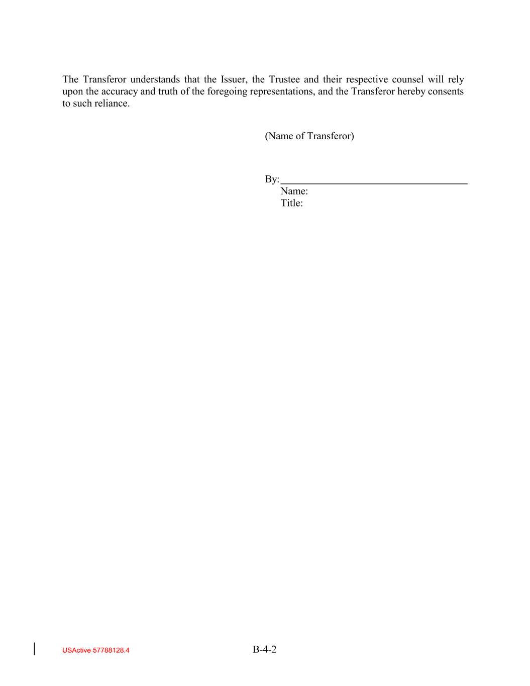The Transferor understands that the Issuer, the Trustee and their respective counsel will rely upon the accuracy and truth of the foregoing representations, and the Transferor hereby consents to such reliance. (Name of Transferor) By: Name: Title: USActive 57788128.4 B-4-2