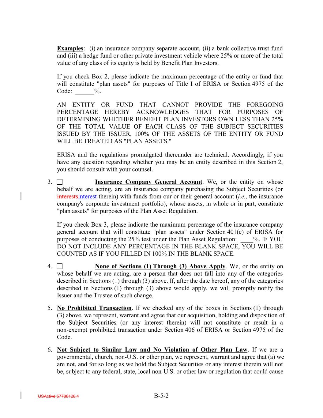 Examples: (i) an insurance company separate account, (ii) a bank collective trust fund and (iii) a hedge fund or other private investment vehicle where 25% or more of the total value of any class of its equity is held by Benefit Plan Investors. If you check Box 2, please indicate the maximum percentage of the entity or fund that will constitute "plan assets" for purposes of Title I of ERISA or Section 4975 of the Code: ______%. AN ENTITY OR FUND THAT CANNOT PROVIDE THE FOREGOING PERCENTAGE HEREBY ACKNOWLEDGES THAT FOR PURPOSES OF DETERMINING WHETHER BENEFIT PLAN INVESTORS OWN LESS THAN 25% OF THE TOTAL VALUE OF EACH CLASS OF THE SUBJECT SECURITIES ISSUED BY THE ISSUER, 100% OF THE ASSETS OF THE ENTITY OR FUND WILL BE TREATED AS "PLAN ASSETS." ERISA and the regulations promulgated thereunder are technical. Accordingly, if you have any question regarding whether you may be an entity described in this Section 2, you should consult with your counsel. 3. Insurance Company General Account. We, or the entity on whose behalf we are acting, are an insurance company purchasing the Subject Securities (or interestsinterest therein) with funds from our or their general account (i.e., the insurance company's corporate investment portfolio), whose assets, in whole or in part, constitute "plan assets" for purposes of the Plan Asset Regulation. If you check Box 3, please indicate the maximum percentage of the insurance company general account that will constitute "plan assets" under Section 401(c) of ERISA for purposes of conducting the 25% test under the Plan Asset Regulation: ____%. IF YOU DO NOT INCLUDE ANY PERCENTAGE IN THE BLANK SPACE, YOU WILL BE COUNTED AS IF YOU FILLED IN 100% IN THE BLANK SPACE. 4. None of Sections (1) Through (3) Above Apply. We, or the entity on whose behalf we are acting, are a person that does not fall into any of the categories described in Sections (1) through (3) above. If, after the date hereof, any of the categories described in Sections (1) through (3) above would apply, we will promptly notify the Issuer and the Trustee of such change. 5. No Prohibited Transaction. If we checked any of the boxes in Sections (1) through (3) above, we represent, warrant and agree that our acquisition, holding and disposition of the Subject Securities (or any interest therein) will not constitute or result in a non-exempt prohibited transaction under Section 406 of ERISA or Section 4975 of the Code. 6. Not Subject to Similar Law and No Violation of Other Plan Law. If we are a governmental, church, non-U.S. or other plan, we represent, warrant and agree that (a) we are not, and for so long as we hold the Subject Securities or any interest therein will not be, subject to any federal, state, local non-U.S. or other law or regulation that could cause USActive 57788128.4 B-5-2