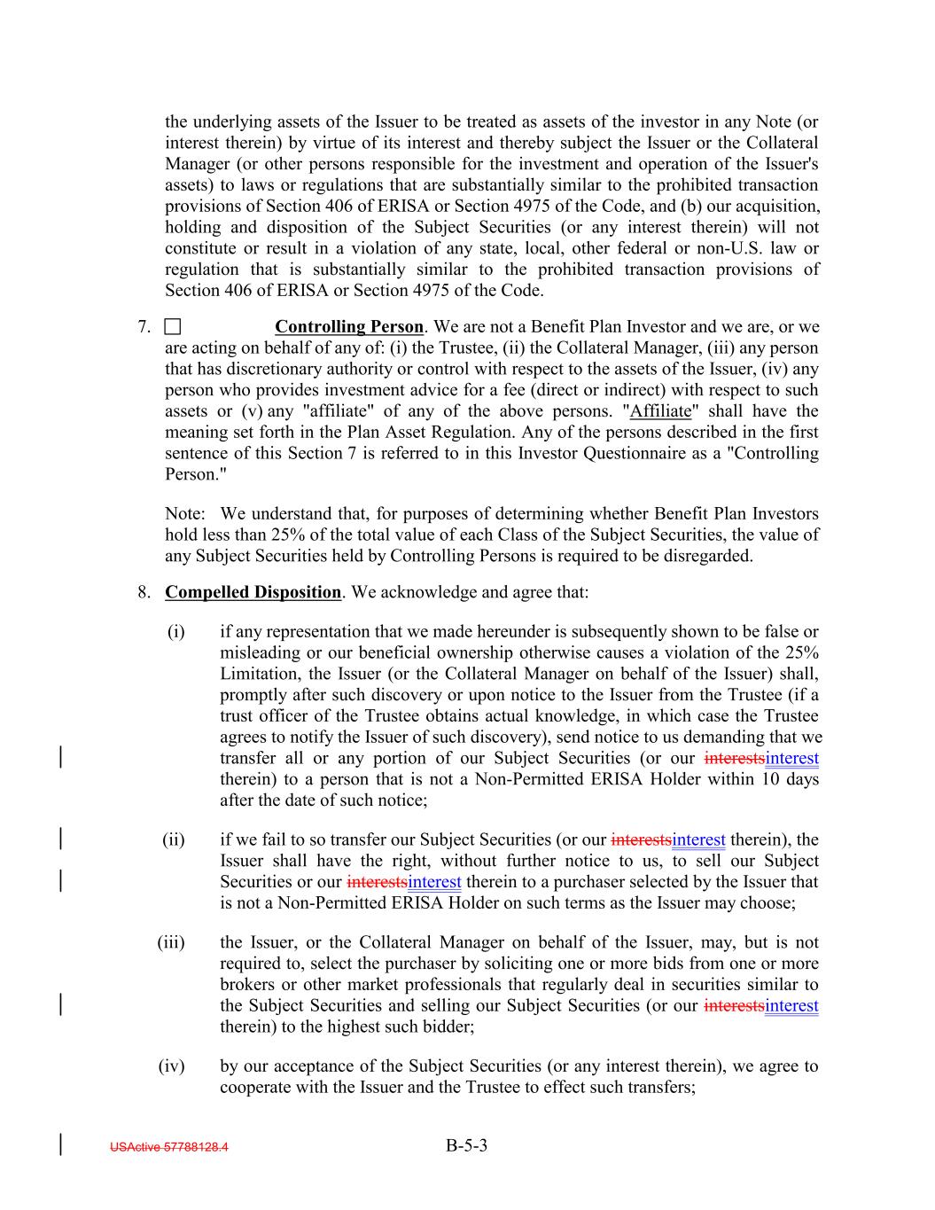 the underlying assets of the Issuer to be treated as assets of the investor in any Note (or interest therein) by virtue of its interest and thereby subject the Issuer or the Collateral Manager (or other persons responsible for the investment and operation of the Issuer's assets) to laws or regulations that are substantially similar to the prohibited transaction provisions of Section 406 of ERISA or Section 4975 of the Code, and (b) our acquisition, holding and disposition of the Subject Securities (or any interest therein) will not constitute or result in a violation of any state, local, other federal or non-U.S. law or regulation that is substantially similar to the prohibited transaction provisions of Section 406 of ERISA or Section 4975 of the Code. 7. Controlling Person. We are not a Benefit Plan Investor and we are, or we are acting on behalf of any of: (i) the Trustee, (ii) the Collateral Manager, (iii) any person that has discretionary authority or control with respect to the assets of the Issuer, (iv) any person who provides investment advice for a fee (direct or indirect) with respect to such assets or (v) any "affiliate" of any of the above persons. "Affiliate" shall have the meaning set forth in the Plan Asset Regulation. Any of the persons described in the first sentence of this Section 7 is referred to in this Investor Questionnaire as a "Controlling Person." Note: We understand that, for purposes of determining whether Benefit Plan Investors hold less than 25% of the total value of each Class of the Subject Securities, the value of any Subject Securities held by Controlling Persons is required to be disregarded. 8. Compelled Disposition. We acknowledge and agree that: (i) if any representation that we made hereunder is subsequently shown to be false or misleading or our beneficial ownership otherwise causes a violation of the 25% Limitation, the Issuer (or the Collateral Manager on behalf of the Issuer) shall, promptly after such discovery or upon notice to the Issuer from the Trustee (if a trust officer of the Trustee obtains actual knowledge, in which case the Trustee agrees to notify the Issuer of such discovery), send notice to us demanding that we transfer all or any portion of our Subject Securities (or our interestsinterest therein) to a person that is not a Non-Permitted ERISA Holder within 10 days after the date of such notice; (ii) if we fail to so transfer our Subject Securities (or our interestsinterest therein), the Issuer shall have the right, without further notice to us, to sell our Subject Securities or our interestsinterest therein to a purchaser selected by the Issuer that is not a Non-Permitted ERISA Holder on such terms as the Issuer may choose; (iii) the Issuer, or the Collateral Manager on behalf of the Issuer, may, but is not required to, select the purchaser by soliciting one or more bids from one or more brokers or other market professionals that regularly deal in securities similar to the Subject Securities and selling our Subject Securities (or our interestsinterest therein) to the highest such bidder; (iv) by our acceptance of the Subject Securities (or any interest therein), we agree to cooperate with the Issuer and the Trustee to effect such transfers; USActive 57788128.4 B-5-3