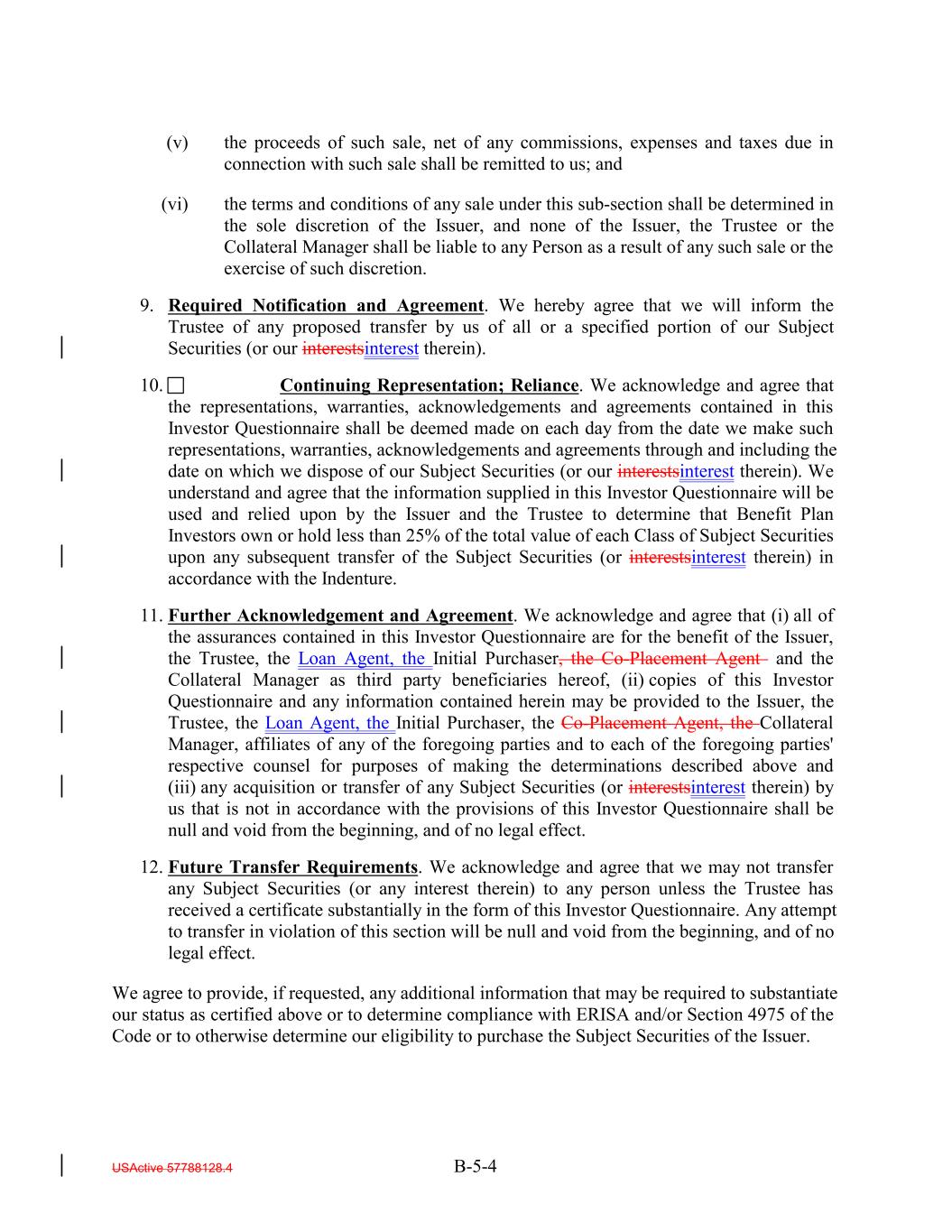 (v) the proceeds of such sale, net of any commissions, expenses and taxes due in connection with such sale shall be remitted to us; and (vi) the terms and conditions of any sale under this sub-section shall be determined in the sole discretion of the Issuer, and none of the Issuer, the Trustee or the Collateral Manager shall be liable to any Person as a result of any such sale or the exercise of such discretion. 9. Required Notification and Agreement. We hereby agree that we will inform the Trustee of any proposed transfer by us of all or a specified portion of our Subject Securities (or our interestsinterest therein). 10. Continuing Representation; Reliance. We acknowledge and agree that the representations, warranties, acknowledgements and agreements contained in this Investor Questionnaire shall be deemed made on each day from the date we make such representations, warranties, acknowledgements and agreements through and including the date on which we dispose of our Subject Securities (or our interestsinterest therein). We understand and agree that the information supplied in this Investor Questionnaire will be used and relied upon by the Issuer and the Trustee to determine that Benefit Plan Investors own or hold less than 25% of the total value of each Class of Subject Securities upon any subsequent transfer of the Subject Securities (or interestsinterest therein) in accordance with the Indenture. 11. Further Acknowledgement and Agreement. We acknowledge and agree that (i) all of the assurances contained in this Investor Questionnaire are for the benefit of the Issuer, the Trustee, the Loan Agent, the Initial Purchaser, the Co-Placement Agent and the Collateral Manager as third party beneficiaries hereof, (ii) copies of this Investor Questionnaire and any information contained herein may be provided to the Issuer, the Trustee, the Loan Agent, the Initial Purchaser, the Co-Placement Agent, the Collateral Manager, affiliates of any of the foregoing parties and to each of the foregoing parties' respective counsel for purposes of making the determinations described above and (iii) any acquisition or transfer of any Subject Securities (or interestsinterest therein) by us that is not in accordance with the provisions of this Investor Questionnaire shall be null and void from the beginning, and of no legal effect. 12. Future Transfer Requirements. We acknowledge and agree that we may not transfer any Subject Securities (or any interest therein) to any person unless the Trustee has received a certificate substantially in the form of this Investor Questionnaire. Any attempt to transfer in violation of this section will be null and void from the beginning, and of no legal effect. We agree to provide, if requested, any additional information that may be required to substantiate our status as certified above or to determine compliance with ERISA and/or Section 4975 of the Code or to otherwise determine our eligibility to purchase the Subject Securities of the Issuer. USActive 57788128.4 B-5-4