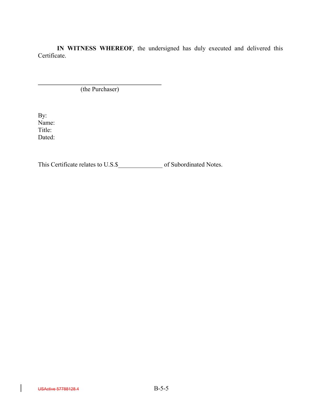IN WITNESS WHEREOF, the undersigned has duly executed and delivered this Certificate. (the Purchaser) By: Name: Title: Dated: This Certificate relates to U.S.$______________ of Subordinated Notes. USActive 57788128.4 B-5-5