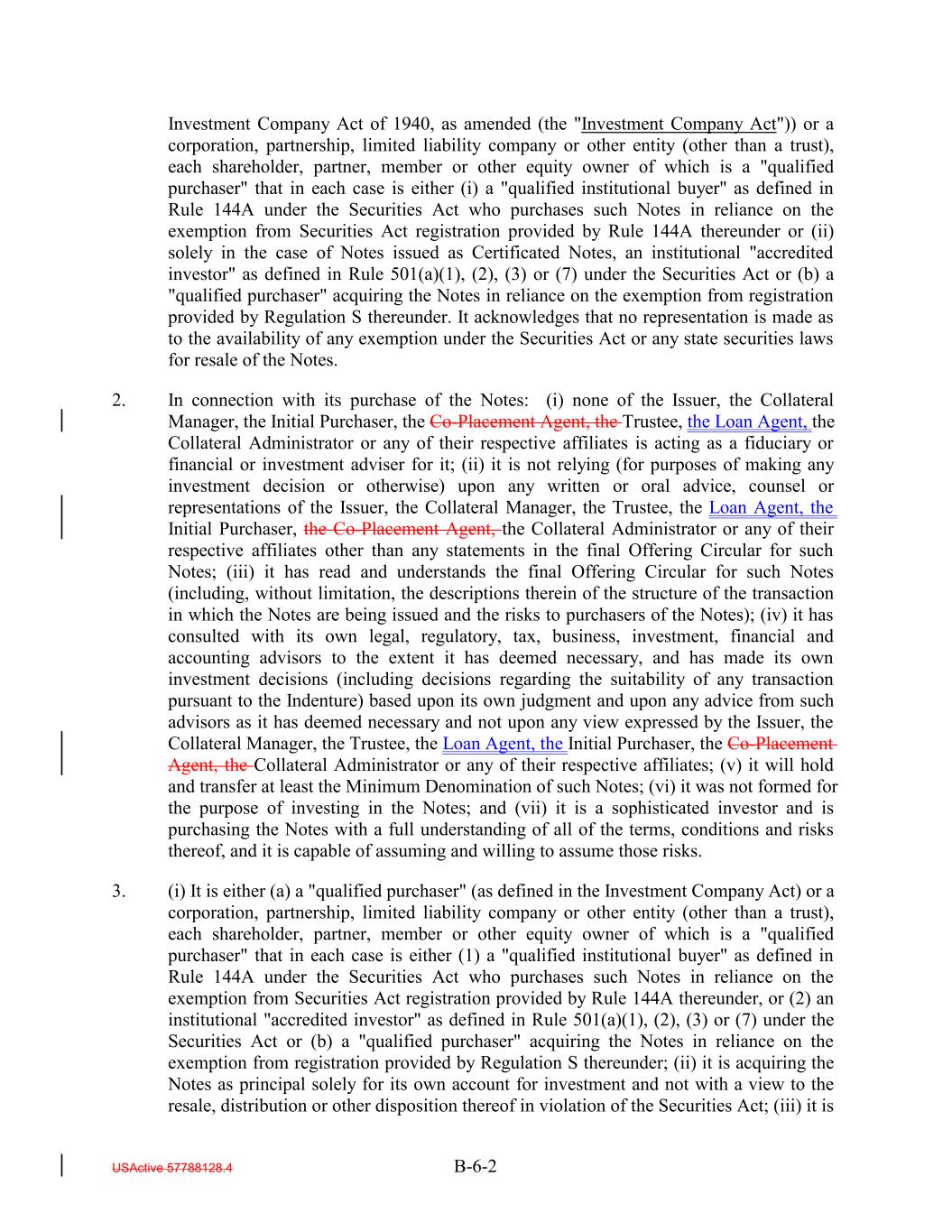 Investment Company Act of 1940, as amended (the "Investment Company Act")) or a corporation, partnership, limited liability company or other entity (other than a trust), each shareholder, partner, member or other equity owner of which is a "qualified purchaser" that in each case is either (i) a "qualified institutional buyer" as defined in Rule 144A under the Securities Act who purchases such Notes in reliance on the exemption from Securities Act registration provided by Rule 144A thereunder or (ii) solely in the case of Notes issued as Certificated Notes, an institutional "accredited investor" as defined in Rule 501(a)(1), (2), (3) or (7) under the Securities Act or (b) a "qualified purchaser" acquiring the Notes in reliance on the exemption from registration provided by Regulation S thereunder. It acknowledges that no representation is made as to the availability of any exemption under the Securities Act or any state securities laws for resale of the Notes. 2. In connection with its purchase of the Notes: (i) none of the Issuer, the Collateral Manager, the Initial Purchaser, the Co-Placement Agent, the Trustee, the Loan Agent, the Collateral Administrator or any of their respective affiliates is acting as a fiduciary or financial or investment adviser for it; (ii) it is not relying (for purposes of making any investment decision or otherwise) upon any written or oral advice, counsel or representations of the Issuer, the Collateral Manager, the Trustee, the Loan Agent, the Initial Purchaser, the Co-Placement Agent, the Collateral Administrator or any of their respective affiliates other than any statements in the final Offering Circular for such Notes; (iii) it has read and understands the final Offering Circular for such Notes (including, without limitation, the descriptions therein of the structure of the transaction in which the Notes are being issued and the risks to purchasers of the Notes); (iv) it has consulted with its own legal, regulatory, tax, business, investment, financial and accounting advisors to the extent it has deemed necessary, and has made its own investment decisions (including decisions regarding the suitability of any transaction pursuant to the Indenture) based upon its own judgment and upon any advice from such advisors as it has deemed necessary and not upon any view expressed by the Issuer, the Collateral Manager, the Trustee, the Loan Agent, the Initial Purchaser, the Co-Placement Agent, the Collateral Administrator or any of their respective affiliates; (v) it will hold and transfer at least the Minimum Denomination of such Notes; (vi) it was not formed for the purpose of investing in the Notes; and (vii) it is a sophisticated investor and is purchasing the Notes with a full understanding of all of the terms, conditions and risks thereof, and it is capable of assuming and willing to assume those risks. 3. (i) It is either (a) a "qualified purchaser" (as defined in the Investment Company Act) or a corporation, partnership, limited liability company or other entity (other than a trust), each shareholder, partner, member or other equity owner of which is a "qualified purchaser" that in each case is either (1) a "qualified institutional buyer" as defined in Rule 144A under the Securities Act who purchases such Notes in reliance on the exemption from Securities Act registration provided by Rule 144A thereunder, or (2) an institutional "accredited investor" as defined in Rule 501(a)(1), (2), (3) or (7) under the Securities Act or (b) a "qualified purchaser" acquiring the Notes in reliance on the exemption from registration provided by Regulation S thereunder; (ii) it is acquiring the Notes as principal solely for its own account for investment and not with a view to the resale, distribution or other disposition thereof in violation of the Securities Act; (iii) it is USActive 57788128.4 B-6-2