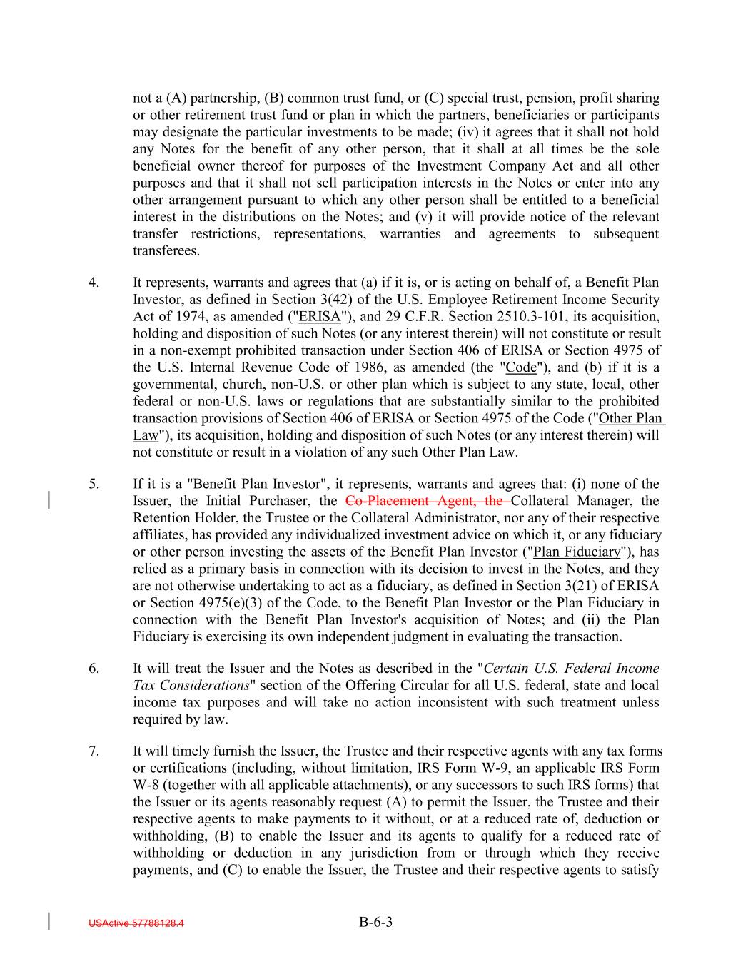 not a (A) partnership, (B) common trust fund, or (C) special trust, pension, profit sharing or other retirement trust fund or plan in which the partners, beneficiaries or participants may designate the particular investments to be made; (iv) it agrees that it shall not hold any Notes for the benefit of any other person, that it shall at all times be the sole beneficial owner thereof for purposes of the Investment Company Act and all other purposes and that it shall not sell participation interests in the Notes or enter into any other arrangement pursuant to which any other person shall be entitled to a beneficial interest in the distributions on the Notes; and (v) it will provide notice of the relevant transfer restrictions, representations, warranties and agreements to subsequent transferees. 4. It represents, warrants and agrees that (a) if it is, or is acting on behalf of, a Benefit Plan Investor, as defined in Section 3(42) of the U.S. Employee Retirement Income Security Act of 1974, as amended ("ERISA"), and 29 C.F.R. Section 2510.3-101, its acquisition, holding and disposition of such Notes (or any interest therein) will not constitute or result in a non-exempt prohibited transaction under Section 406 of ERISA or Section 4975 of the U.S. Internal Revenue Code of 1986, as amended (the "Code"), and (b) if it is a governmental, church, non-U.S. or other plan which is subject to any state, local, other federal or non-U.S. laws or regulations that are substantially similar to the prohibited transaction provisions of Section 406 of ERISA or Section 4975 of the Code ("Other Plan Law"), its acquisition, holding and disposition of such Notes (or any interest therein) will not constitute or result in a violation of any such Other Plan Law. 5. If it is a "Benefit Plan Investor", it represents, warrants and agrees that: (i) none of the Issuer, the Initial Purchaser, the Co-Placement Agent, the Collateral Manager, the Retention Holder, the Trustee or the Collateral Administrator, nor any of their respective affiliates, has provided any individualized investment advice on which it, or any fiduciary or other person investing the assets of the Benefit Plan Investor ("Plan Fiduciary"), has relied as a primary basis in connection with its decision to invest in the Notes, and they are not otherwise undertaking to act as a fiduciary, as defined in Section 3(21) of ERISA or Section 4975(e)(3) of the Code, to the Benefit Plan Investor or the Plan Fiduciary in connection with the Benefit Plan Investor's acquisition of Notes; and (ii) the Plan Fiduciary is exercising its own independent judgment in evaluating the transaction. 6. It will treat the Issuer and the Notes as described in the "Certain U.S. Federal Income Tax Considerations" section of the Offering Circular for all U.S. federal, state and local income tax purposes and will take no action inconsistent with such treatment unless required by law. 7. It will timely furnish the Issuer, the Trustee and their respective agents with any tax forms or certifications (including, without limitation, IRS Form W-9, an applicable IRS Form W-8 (together with all applicable attachments), or any successors to such IRS forms) that the Issuer or its agents reasonably request (A) to permit the Issuer, the Trustee and their respective agents to make payments to it without, or at a reduced rate of, deduction or withholding, (B) to enable the Issuer and its agents to qualify for a reduced rate of withholding or deduction in any jurisdiction from or through which they receive payments, and (C) to enable the Issuer, the Trustee and their respective agents to satisfy USActive 57788128.4 B-6-3