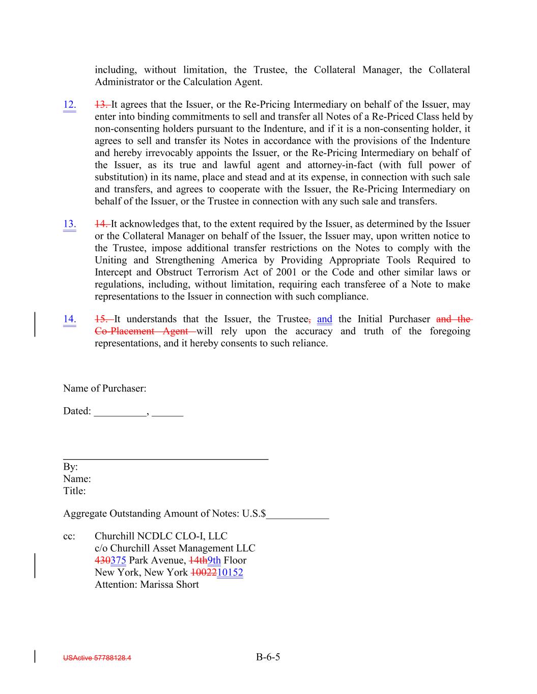 including, without limitation, the Trustee, the Collateral Manager, the Collateral Administrator or the Calculation Agent. 12. 13. It agrees that the Issuer, or the Re-Pricing Intermediary on behalf of the Issuer, may enter into binding commitments to sell and transfer all Notes of a Re-Priced Class held by non-consenting holders pursuant to the Indenture, and if it is a non-consenting holder, it agrees to sell and transfer its Notes in accordance with the provisions of the Indenture and hereby irrevocably appoints the Issuer, or the Re-Pricing Intermediary on behalf of the Issuer, as its true and lawful agent and attorney-in-fact (with full power of substitution) in its name, place and stead and at its expense, in connection with such sale and transfers, and agrees to cooperate with the Issuer, the Re-Pricing Intermediary on behalf of the Issuer, or the Trustee in connection with any such sale and transfers. 13. 14. It acknowledges that, to the extent required by the Issuer, as determined by the Issuer or the Collateral Manager on behalf of the Issuer, the Issuer may, upon written notice to the Trustee, impose additional transfer restrictions on the Notes to comply with the Uniting and Strengthening America by Providing Appropriate Tools Required to Intercept and Obstruct Terrorism Act of 2001 or the Code and other similar laws or regulations, including, without limitation, requiring each transferee of a Note to make representations to the Issuer in connection with such compliance. 14. 15. It understands that the Issuer, the Trustee, and the Initial Purchaser and the Co-Placement Agent will rely upon the accuracy and truth of the foregoing representations, and it hereby consents to such reliance. Name of Purchaser: Dated: __________, ______ By: Name: Title: Aggregate Outstanding Amount of Notes: U.S.$____________ cc: Churchill NCDLC CLO-I, LLC c/o Churchill Asset Management LLC 430375 Park Avenue, 14th9th Floor New York, New York 1002210152 Attention: Marissa Short USActive 57788128.4 B-6-5