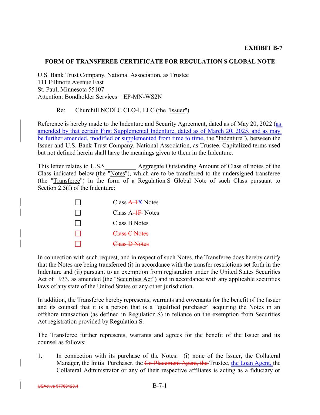EXHIBIT B-7 FORM OF TRANSFEREE CERTIFICATE FOR REGULATION S GLOBAL NOTE U.S. Bank Trust Company, National Association, as Trustee 111 Fillmore Avenue East St. Paul, Minnesota 55107 Attention: Bondholder Services – EP-MN-WS2N Re: Churchill NCDLC CLO-I, LLC (the "Issuer") Reference is hereby made to the Indenture and Security Agreement, dated as of May 20, 2022 (as amended by that certain First Supplemental Indenture, dated as of March 20, 2025, and as may be further amended, modified or supplemented from time to time, the "Indenture"), between the Issuer and U.S. Bank Trust Company, National Association, as Trustee. Capitalized terms used but not defined herein shall have the meanings given to them in the Indenture. This letter relates to U.S.$__________ Aggregate Outstanding Amount of Class of notes of the Class indicated below (the "Notes"), which are to be transferred to the undersigned transferee (the "Transferee") in the form of a Regulation S Global Note of such Class pursuant to Section 2.5(f) of the Indenture: Class A-1X Notes Class A-1F Notes Class B Notes Class C Notes Class D Notes In connection with such request, and in respect of such Notes, the Transferee does hereby certify that the Notes are being transferred (i) in accordance with the transfer restrictions set forth in the Indenture and (ii) pursuant to an exemption from registration under the United States Securities Act of 1933, as amended (the "Securities Act") and in accordance with any applicable securities laws of any state of the United States or any other jurisdiction. In addition, the Transferee hereby represents, warrants and covenants for the benefit of the Issuer and its counsel that it is a person that is a "qualified purchaser" acquiring the Notes in an offshore transaction (as defined in Regulation S) in reliance on the exemption from Securities Act registration provided by Regulation S. The Transferee further represents, warrants and agrees for the benefit of the Issuer and its counsel as follows: 1. In connection with its purchase of the Notes: (i) none of the Issuer, the Collateral Manager, the Initial Purchaser, the Co-Placement Agent, the Trustee, the Loan Agent, the Collateral Administrator or any of their respective affiliates is acting as a fiduciary or USActive 57788128.4 B-7-1
