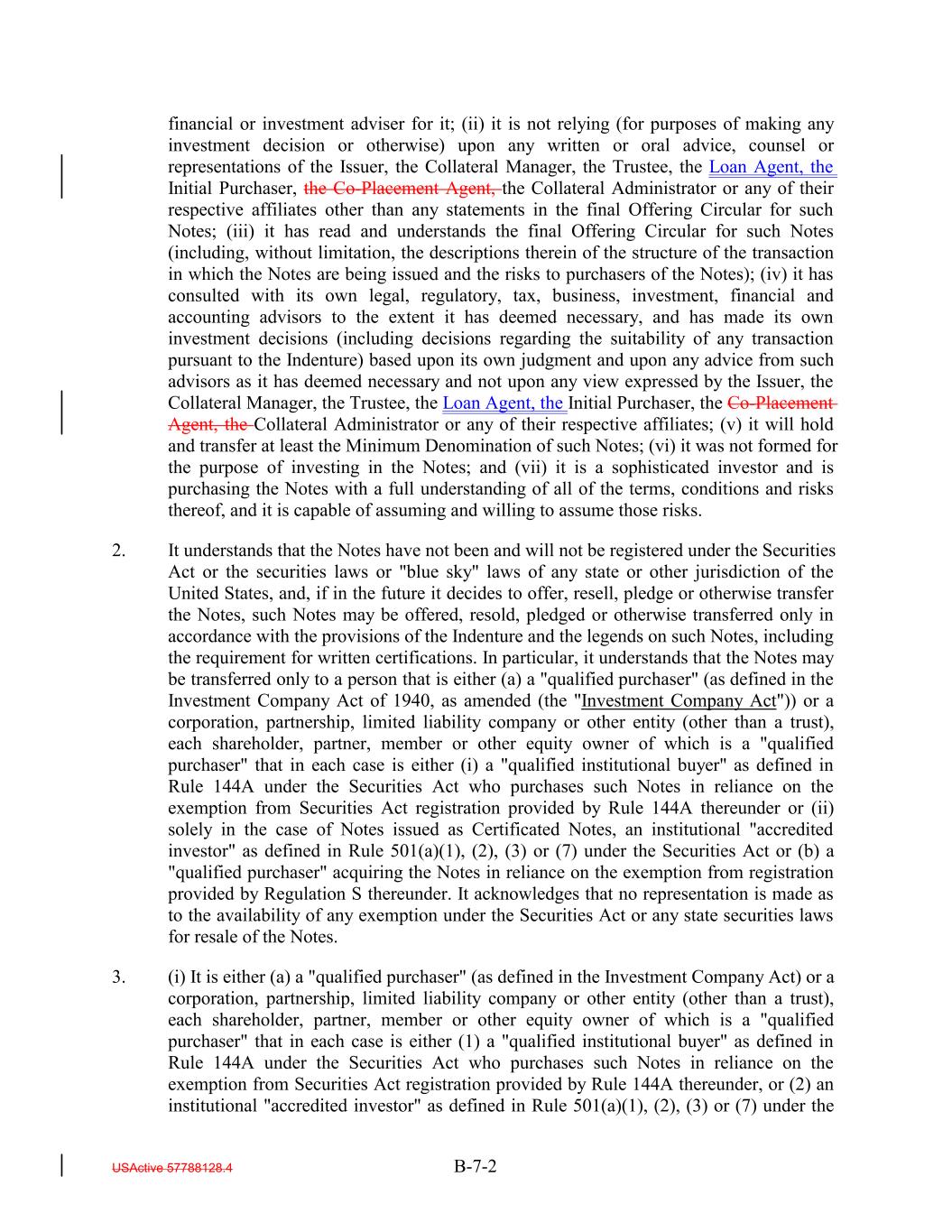 financial or investment adviser for it; (ii) it is not relying (for purposes of making any investment decision or otherwise) upon any written or oral advice, counsel or representations of the Issuer, the Collateral Manager, the Trustee, the Loan Agent, the Initial Purchaser, the Co-Placement Agent, the Collateral Administrator or any of their respective affiliates other than any statements in the final Offering Circular for such Notes; (iii) it has read and understands the final Offering Circular for such Notes (including, without limitation, the descriptions therein of the structure of the transaction in which the Notes are being issued and the risks to purchasers of the Notes); (iv) it has consulted with its own legal, regulatory, tax, business, investment, financial and accounting advisors to the extent it has deemed necessary, and has made its own investment decisions (including decisions regarding the suitability of any transaction pursuant to the Indenture) based upon its own judgment and upon any advice from such advisors as it has deemed necessary and not upon any view expressed by the Issuer, the Collateral Manager, the Trustee, the Loan Agent, the Initial Purchaser, the Co-Placement Agent, the Collateral Administrator or any of their respective affiliates; (v) it will hold and transfer at least the Minimum Denomination of such Notes; (vi) it was not formed for the purpose of investing in the Notes; and (vii) it is a sophisticated investor and is purchasing the Notes with a full understanding of all of the terms, conditions and risks thereof, and it is capable of assuming and willing to assume those risks. 2. It understands that the Notes have not been and will not be registered under the Securities Act or the securities laws or "blue sky" laws of any state or other jurisdiction of the United States, and, if in the future it decides to offer, resell, pledge or otherwise transfer the Notes, such Notes may be offered, resold, pledged or otherwise transferred only in accordance with the provisions of the Indenture and the legends on such Notes, including the requirement for written certifications. In particular, it understands that the Notes may be transferred only to a person that is either (a) a "qualified purchaser" (as defined in the Investment Company Act of 1940, as amended (the "Investment Company Act")) or a corporation, partnership, limited liability company or other entity (other than a trust), each shareholder, partner, member or other equity owner of which is a "qualified purchaser" that in each case is either (i) a "qualified institutional buyer" as defined in Rule 144A under the Securities Act who purchases such Notes in reliance on the exemption from Securities Act registration provided by Rule 144A thereunder or (ii) solely in the case of Notes issued as Certificated Notes, an institutional "accredited investor" as defined in Rule 501(a)(1), (2), (3) or (7) under the Securities Act or (b) a "qualified purchaser" acquiring the Notes in reliance on the exemption from registration provided by Regulation S thereunder. It acknowledges that no representation is made as to the availability of any exemption under the Securities Act or any state securities laws for resale of the Notes. 3. (i) It is either (a) a "qualified purchaser" (as defined in the Investment Company Act) or a corporation, partnership, limited liability company or other entity (other than a trust), each shareholder, partner, member or other equity owner of which is a "qualified purchaser" that in each case is either (1) a "qualified institutional buyer" as defined in Rule 144A under the Securities Act who purchases such Notes in reliance on the exemption from Securities Act registration provided by Rule 144A thereunder, or (2) an institutional "accredited investor" as defined in Rule 501(a)(1), (2), (3) or (7) under the USActive 57788128.4 B-7-2