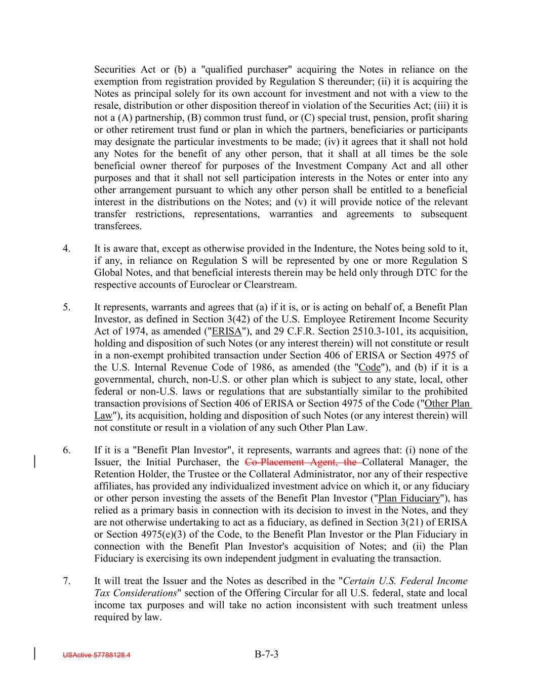 Securities Act or (b) a "qualified purchaser" acquiring the Notes in reliance on the exemption from registration provided by Regulation S thereunder; (ii) it is acquiring the Notes as principal solely for its own account for investment and not with a view to the resale, distribution or other disposition thereof in violation of the Securities Act; (iii) it is not a (A) partnership, (B) common trust fund, or (C) special trust, pension, profit sharing or other retirement trust fund or plan in which the partners, beneficiaries or participants may designate the particular investments to be made; (iv) it agrees that it shall not hold any Notes for the benefit of any other person, that it shall at all times be the sole beneficial owner thereof for purposes of the Investment Company Act and all other purposes and that it shall not sell participation interests in the Notes or enter into any other arrangement pursuant to which any other person shall be entitled to a beneficial interest in the distributions on the Notes; and (v) it will provide notice of the relevant transfer restrictions, representations, warranties and agreements to subsequent transferees. 4. It is aware that, except as otherwise provided in the Indenture, the Notes being sold to it, if any, in reliance on Regulation S will be represented by one or more Regulation S Global Notes, and that beneficial interests therein may be held only through DTC for the respective accounts of Euroclear or Clearstream. 5. It represents, warrants and agrees that (a) if it is, or is acting on behalf of, a Benefit Plan Investor, as defined in Section 3(42) of the U.S. Employee Retirement Income Security Act of 1974, as amended ("ERISA"), and 29 C.F.R. Section 2510.3-101, its acquisition, holding and disposition of such Notes (or any interest therein) will not constitute or result in a non-exempt prohibited transaction under Section 406 of ERISA or Section 4975 of the U.S. Internal Revenue Code of 1986, as amended (the "Code"), and (b) if it is a governmental, church, non-U.S. or other plan which is subject to any state, local, other federal or non-U.S. laws or regulations that are substantially similar to the prohibited transaction provisions of Section 406 of ERISA or Section 4975 of the Code ("Other Plan Law"), its acquisition, holding and disposition of such Notes (or any interest therein) will not constitute or result in a violation of any such Other Plan Law. 6. If it is a "Benefit Plan Investor", it represents, warrants and agrees that: (i) none of the Issuer, the Initial Purchaser, the Co-Placement Agent, the Collateral Manager, the Retention Holder, the Trustee or the Collateral Administrator, nor any of their respective affiliates, has provided any individualized investment advice on which it, or any fiduciary or other person investing the assets of the Benefit Plan Investor ("Plan Fiduciary"), has relied as a primary basis in connection with its decision to invest in the Notes, and they are not otherwise undertaking to act as a fiduciary, as defined in Section 3(21) of ERISA or Section 4975(e)(3) of the Code, to the Benefit Plan Investor or the Plan Fiduciary in connection with the Benefit Plan Investor's acquisition of Notes; and (ii) the Plan Fiduciary is exercising its own independent judgment in evaluating the transaction. 7. It will treat the Issuer and the Notes as described in the "Certain U.S. Federal Income Tax Considerations" section of the Offering Circular for all U.S. federal, state and local income tax purposes and will take no action inconsistent with such treatment unless required by law. USActive 57788128.4 B-7-3