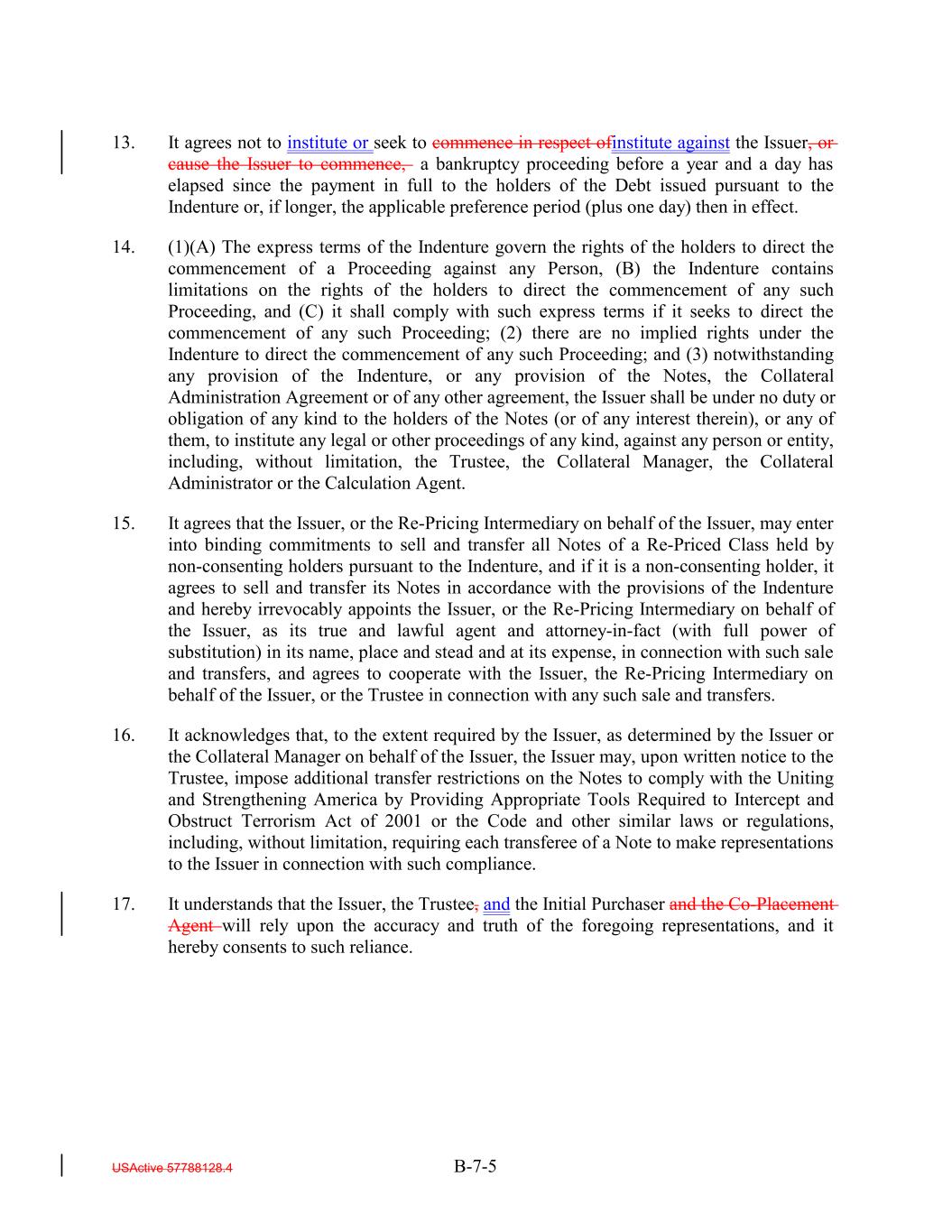 13. It agrees not to institute or seek to commence in respect ofinstitute against the Issuer, or cause the Issuer to commence, a bankruptcy proceeding before a year and a day has elapsed since the payment in full to the holders of the Debt issued pursuant to the Indenture or, if longer, the applicable preference period (plus one day) then in effect. 14. (1)(A) The express terms of the Indenture govern the rights of the holders to direct the commencement of a Proceeding against any Person, (B) the Indenture contains limitations on the rights of the holders to direct the commencement of any such Proceeding, and (C) it shall comply with such express terms if it seeks to direct the commencement of any such Proceeding; (2) there are no implied rights under the Indenture to direct the commencement of any such Proceeding; and (3) notwithstanding any provision of the Indenture, or any provision of the Notes, the Collateral Administration Agreement or of any other agreement, the Issuer shall be under no duty or obligation of any kind to the holders of the Notes (or of any interest therein), or any of them, to institute any legal or other proceedings of any kind, against any person or entity, including, without limitation, the Trustee, the Collateral Manager, the Collateral Administrator or the Calculation Agent. 15. It agrees that the Issuer, or the Re-Pricing Intermediary on behalf of the Issuer, may enter into binding commitments to sell and transfer all Notes of a Re-Priced Class held by non-consenting holders pursuant to the Indenture, and if it is a non-consenting holder, it agrees to sell and transfer its Notes in accordance with the provisions of the Indenture and hereby irrevocably appoints the Issuer, or the Re-Pricing Intermediary on behalf of the Issuer, as its true and lawful agent and attorney-in-fact (with full power of substitution) in its name, place and stead and at its expense, in connection with such sale and transfers, and agrees to cooperate with the Issuer, the Re-Pricing Intermediary on behalf of the Issuer, or the Trustee in connection with any such sale and transfers. 16. It acknowledges that, to the extent required by the Issuer, as determined by the Issuer or the Collateral Manager on behalf of the Issuer, the Issuer may, upon written notice to the Trustee, impose additional transfer restrictions on the Notes to comply with the Uniting and Strengthening America by Providing Appropriate Tools Required to Intercept and Obstruct Terrorism Act of 2001 or the Code and other similar laws or regulations, including, without limitation, requiring each transferee of a Note to make representations to the Issuer in connection with such compliance. 17. It understands that the Issuer, the Trustee, and the Initial Purchaser and the Co-Placement Agent will rely upon the accuracy and truth of the foregoing representations, and it hereby consents to such reliance. USActive 57788128.4 B-7-5