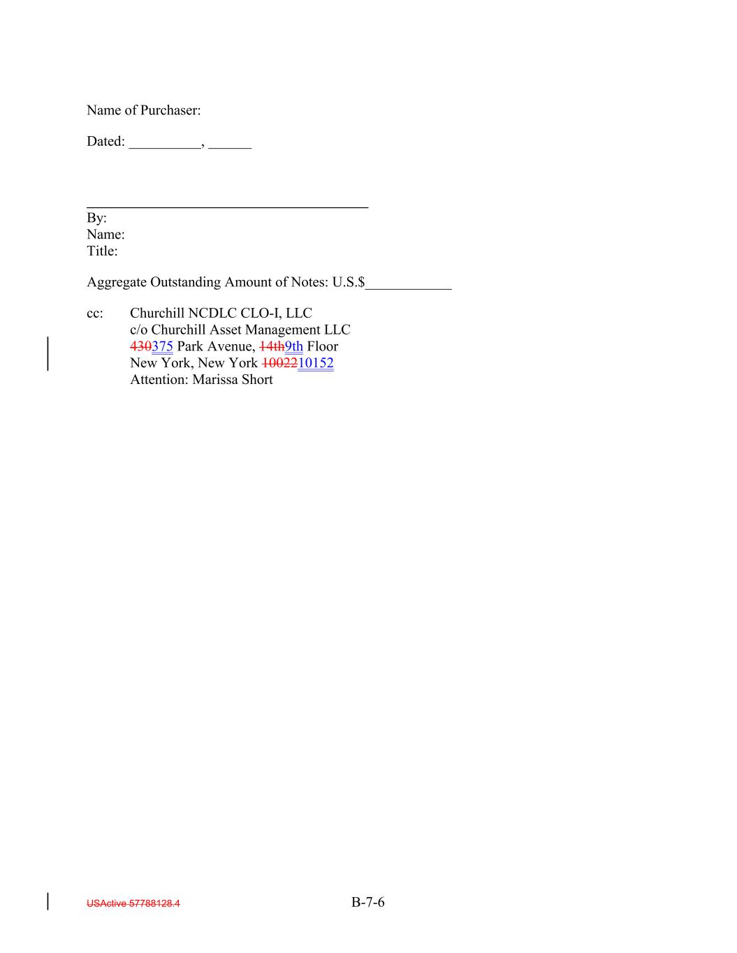 Name of Purchaser: Dated: __________, ______ By: Name: Title: Aggregate Outstanding Amount of Notes: U.S.$____________ cc: Churchill NCDLC CLO-I, LLC c/o Churchill Asset Management LLC 430375 Park Avenue, 14th9th Floor New York, New York 1002210152 Attention: Marissa Short USActive 57788128.4 B-7-6