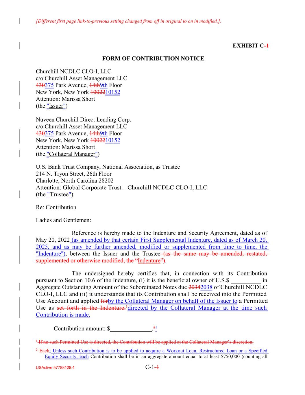 [Different first page link-to-previous setting changed from off in original to on in modified.]. USActive 57788128.4 C-1-1 The undersigned hereby certifies that, in connection with its Contribution pursuant to Section 10.6 of the Indenture, (i) it is the beneficial owner of U.S.$ __________ in Aggregate Outstanding Amount of the Subordinated Notes due 20342038 of Churchill NCDLC CLO-I, LLC and (ii) it understands that its Contribution shall be received into the Permitted Use Account and applied forby the Collateral Manager on behalf of the Issuer to a Permitted Use as set forth in the Indenture.1directed by the Collateral Manager at the time such Contribution is made. Contribution amount: $______________.21 EXHIBIT C-1 FORM OF CONTRIBUTION NOTICE Churchill NCDLC CLO-I, LLC c/o Churchill Asset Management LLC 430375 Park Avenue, 14th9th Floor New York, New York 1002210152 Attention: Marissa Short (the "Issuer") Nuveen Churchill Direct Lending Corp. c/o Churchill Asset Management LLC 430375 Park Avenue, 14th9th Floor New York, New York 1002210152 Attention: Marissa Short (the "Collateral Manager") U.S. Bank Trust Company, National Association, as Trustee 214 N. Tryon Street, 26th Floor Charlotte, North Carolina 28202 Attention: Global Corporate Trust – Churchill NCDLC CLO-I, LLC (the "Trustee") Re: Contribution Ladies and Gentlemen: Reference is hereby made to the Indenture and Security Agreement, dated as of May 20, 2022 (as amended by that certain First Supplemental Indenture, dated as of March 20, 2025, and as may be further amended, modified or supplemented from time to time, the "Indenture"), between the Issuer and the Trustee (as the same may be amended, restated, supplemented or otherwise modified, the “Indenture”). 1 If no such Permitted Use is directed, the Contribution will be applied at the Collateral Manager’s discretion. 2 Each1 Unless such Contribution is to be applied to acquire a Workout Loan, Restructured Loan or a Specified Equity Security, each Contribution shall be in an aggregate amount equal to at least $750,000 (counting all