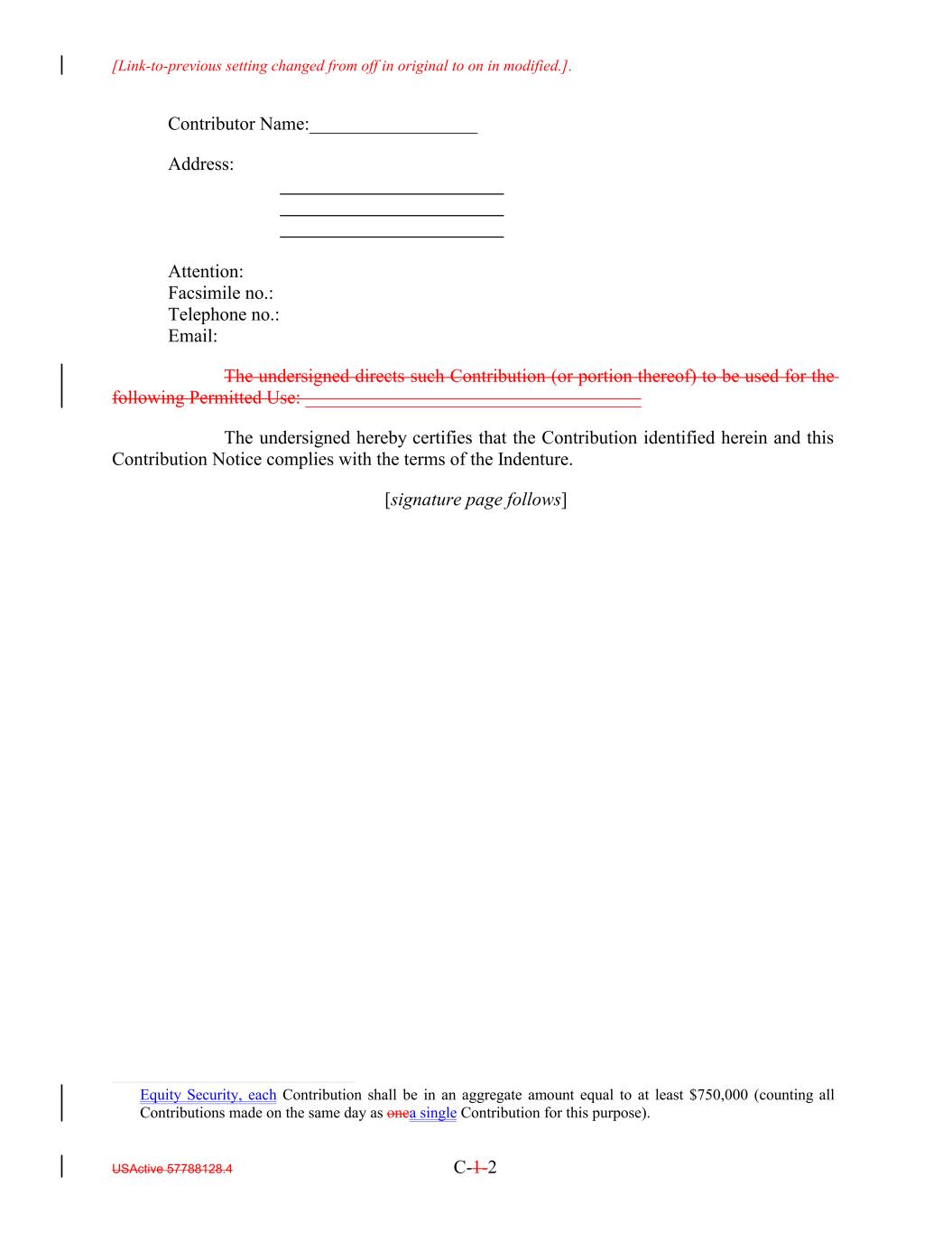 [Link-to-previous setting changed from off in original to on in modified.]. USActive 57788128.4 C-1-2 Contributor Name:__________________ Address: Attention: Facsimile no.: Telephone no.: Email: The undersigned directs such Contribution (or portion thereof) to be used for the following Permitted Use: ____________________________________ The undersigned hereby certifies that the Contribution identified herein and this Contribution Notice complies with the terms of the Indenture. [signature page follows] Equity Security, each Contribution shall be in an aggregate amount equal to at least $750,000 (counting all Contributions made on the same day as onea single Contribution for this purpose).