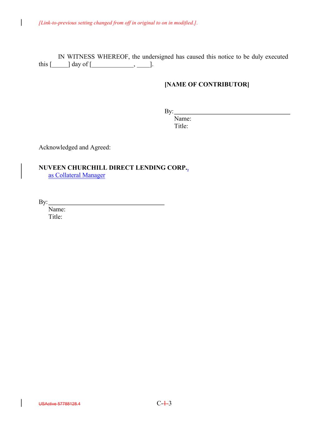 [Link-to-previous setting changed from off in original to on in modified.]. IN WITNESS WHEREOF, the undersigned has caused this notice to be duly executed this [_____] day of [_____________, ____]. [NAME OF CONTRIBUTOR] By: Name: Title: Acknowledged and Agreed: NUVEEN CHURCHILL DIRECT LENDING CORP., as Collateral Manager By: Name: Title: USActive 57788128.4 C-1-3
