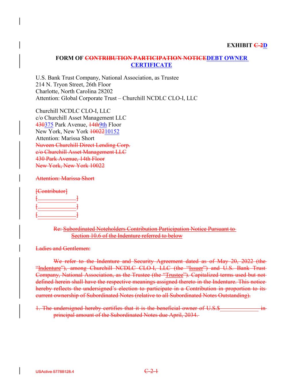 EXHIBIT C-2D FORM OF CONTRIBUTION PARTICIPATION NOTICEDEBT OWNER CERTIFICATE U.S. Bank Trust Company, National Association, as Trustee 214 N. Tryon Street, 26th Floor Charlotte, North Carolina 28202 Attention: Global Corporate Trust – Churchill NCDLC CLO-I, LLC Churchill NCDLC CLO-I, LLC c/o Churchill Asset Management LLC 430375 Park Avenue, 14th9th Floor New York, New York 1002210152 Attention: Marissa Short Nuveen Churchill Direct Lending Corp. c/o Churchill Asset Management LLC 430 Park Avenue, 14th Floor New York, New York 10022 Attention: Marissa Short [Contributor] [_____________] [_____________] [_____________] Re: Subordinated Noteholders Contribution Participation Notice Pursuant to Section 10.6 of the Indenture referred to below Ladies and Gentlemen: We refer to the Indenture and Security Agreement dated as of May 20, 2022 (the “Indenture”), among Churchill NCDLC CLO-I, LLC (the “Issuer”) and U.S. Bank Trust Company, National Association, as the Trustee (the “Trustee”). Capitalized terms used but not defined herein shall have the respective meanings assigned thereto in the Indenture. This notice hereby reflects the undersigned’s election to participate in a Contribution in proportion to its current ownership of Subordinated Notes (relative to all Subordinated Notes Outstanding). 1. The undersigned hereby certifies that it is the beneficial owner of U.S.$_____________ in principal amount of the Subordinated Notes due April, 2034. USActive 57788128.4 C-2-1