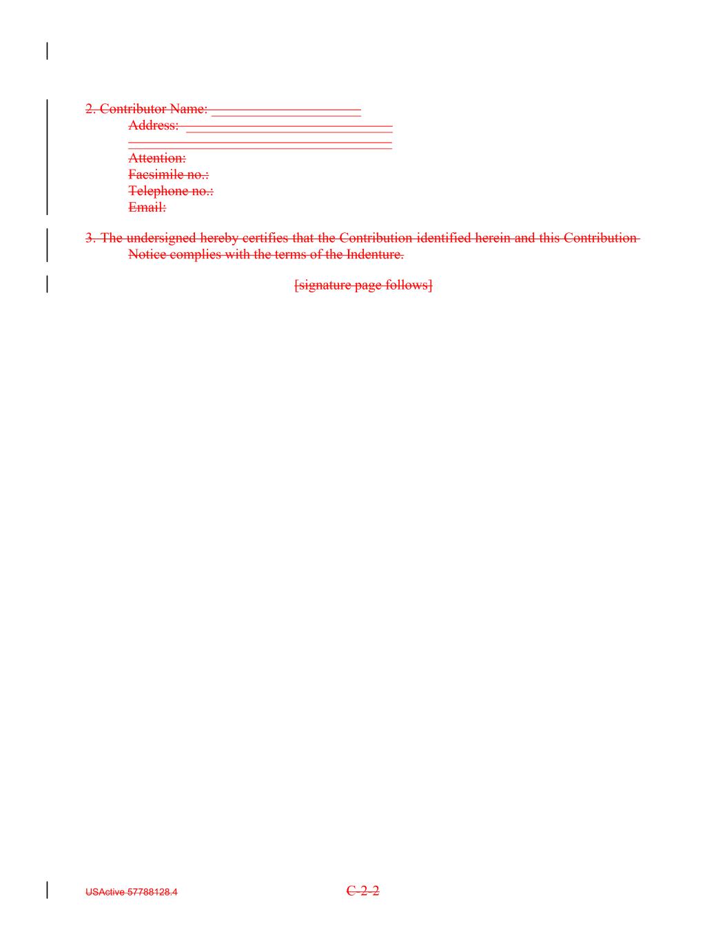 2. Contributor Name: _____________________ Address: _____________________________ _____________________________________ Attention: Facsimile no.: Telephone no.: Email: 3. The undersigned hereby certifies that the Contribution identified herein and this Contribution Notice complies with the terms of the Indenture. [signature page follows] USActive 57788128.4 C-2-2