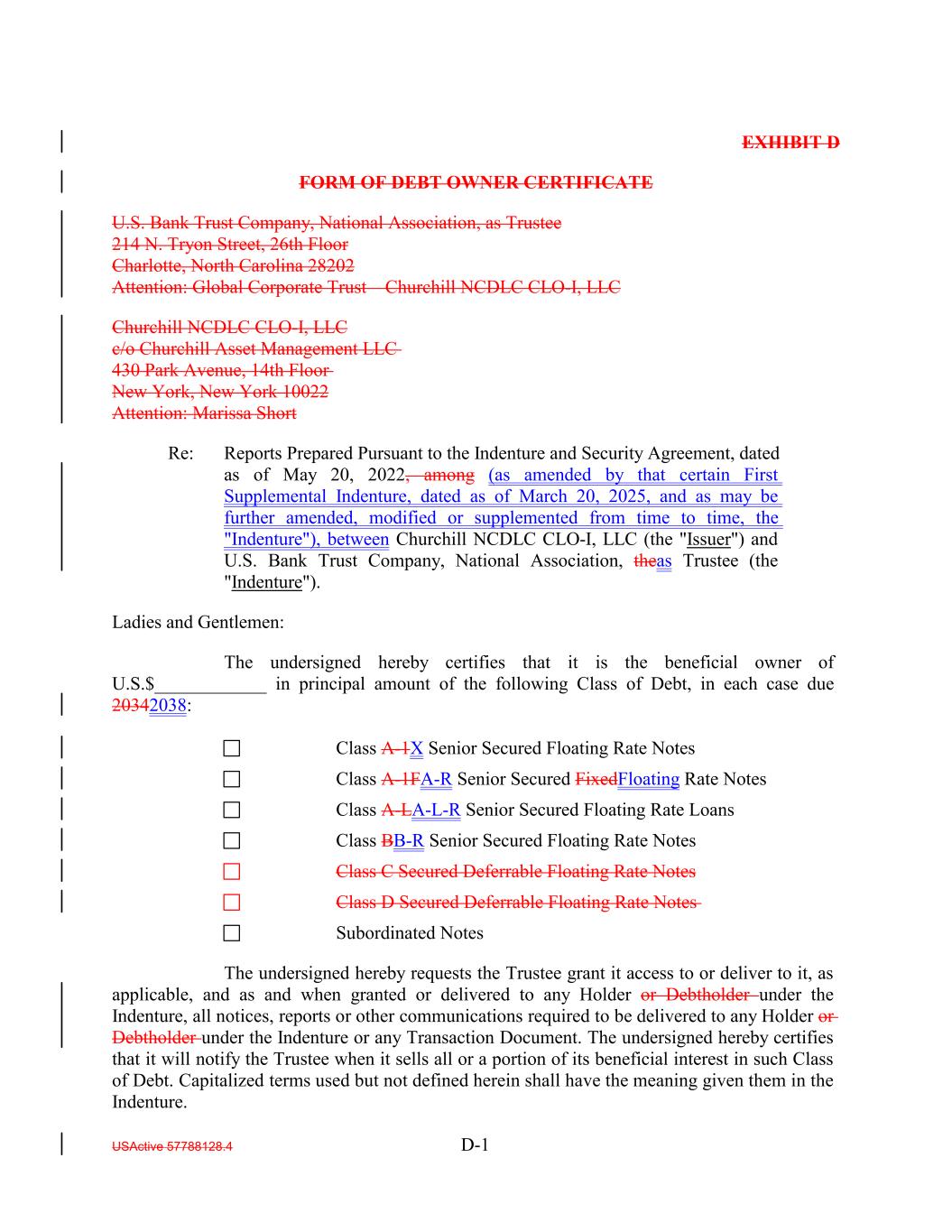EXHIBIT D FORM OF DEBT OWNER CERTIFICATE U.S. Bank Trust Company, National Association, as Trustee 214 N. Tryon Street, 26th Floor Charlotte, North Carolina 28202 Attention: Global Corporate Trust – Churchill NCDLC CLO-I, LLC Churchill NCDLC CLO-I, LLC c/o Churchill Asset Management LLC 430 Park Avenue, 14th Floor New York, New York 10022 Attention: Marissa Short Re: Reports Prepared Pursuant to the Indenture and Security Agreement, dated as of May 20, 2022, among (as amended by that certain First Supplemental Indenture, dated as of March 20, 2025, and as may be further amended, modified or supplemented from time to time, the "Indenture"), between Churchill NCDLC CLO-I, LLC (the "Issuer") and U.S. Bank Trust Company, National Association, theas Trustee (the "Indenture"). Ladies and Gentlemen: The undersigned hereby certifies that it is the beneficial owner of U.S.$____________ in principal amount of the following Class of Debt, in each case due 20342038: Class A-1X Senior Secured Floating Rate Notes Class A-1FA-R Senior Secured FixedFloating Rate Notes Class A-LA-L-R Senior Secured Floating Rate Loans Class BB-R Senior Secured Floating Rate Notes Class C Secured Deferrable Floating Rate Notes Class D Secured Deferrable Floating Rate Notes Subordinated Notes The undersigned hereby requests the Trustee grant it access to or deliver to it, as applicable, and as and when granted or delivered to any Holder or Debtholder under the Indenture, all notices, reports or other communications required to be delivered to any Holder or Debtholder under the Indenture or any Transaction Document. The undersigned hereby certifies that it will notify the Trustee when it sells all or a portion of its beneficial interest in such Class of Debt. Capitalized terms used but not defined herein shall have the meaning given them in the Indenture. USActive 57788128.4 D-1