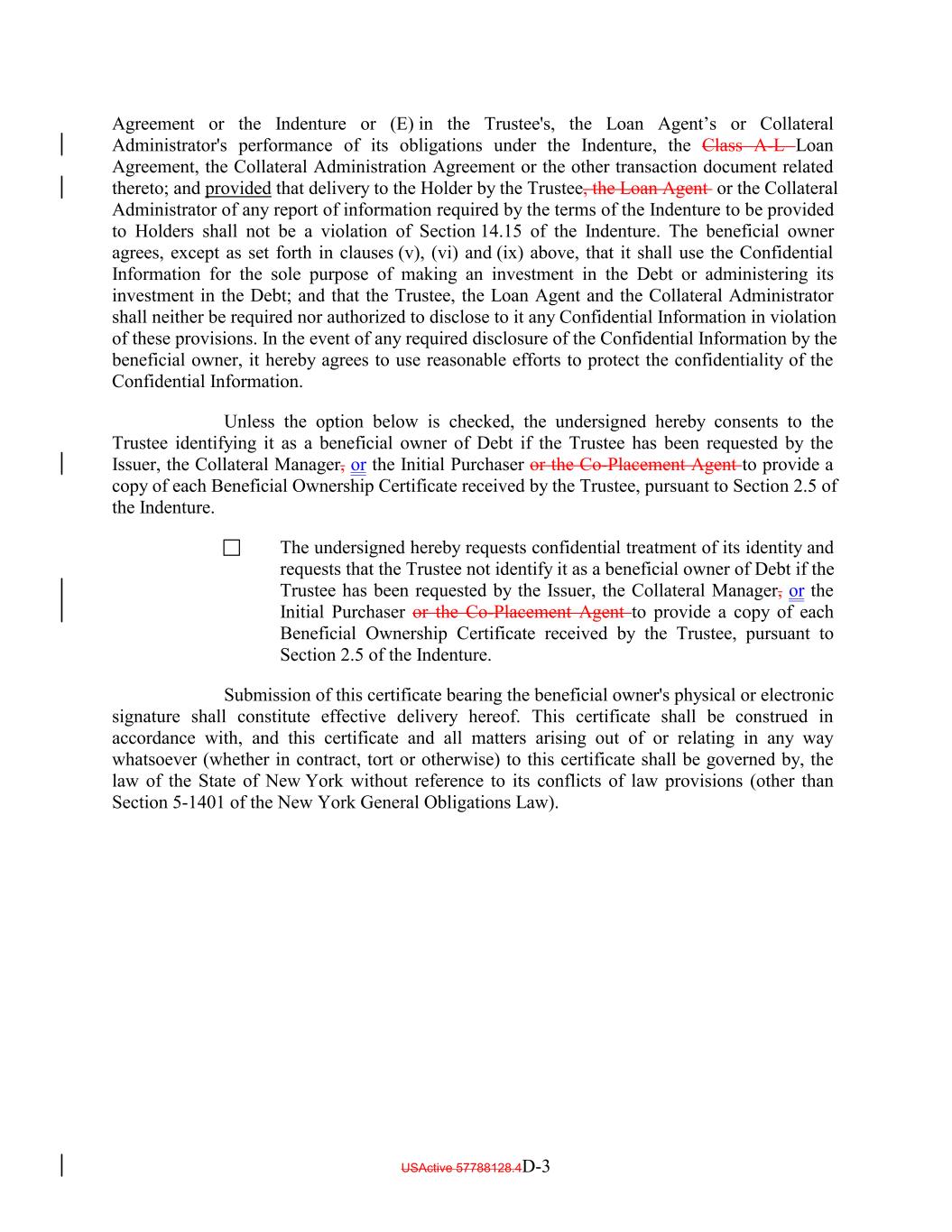 Agreement or the Indenture or (E) in the Trustee's, the Loan Agent’s or Collateral Administrator's performance of its obligations under the Indenture, the Class A-L Loan Agreement, the Collateral Administration Agreement or the other transaction document related thereto; and provided that delivery to the Holder by the Trustee, the Loan Agent or the Collateral Administrator of any report of information required by the terms of the Indenture to be provided to Holders shall not be a violation of Section 14.15 of the Indenture. The beneficial owner agrees, except as set forth in clauses (v), (vi) and (ix) above, that it shall use the Confidential Information for the sole purpose of making an investment in the Debt or administering its investment in the Debt; and that the Trustee, the Loan Agent and the Collateral Administrator shall neither be required nor authorized to disclose to it any Confidential Information in violation of these provisions. In the event of any required disclosure of the Confidential Information by the beneficial owner, it hereby agrees to use reasonable efforts to protect the confidentiality of the Confidential Information. Unless the option below is checked, the undersigned hereby consents to the Trustee identifying it as a beneficial owner of Debt if the Trustee has been requested by the Issuer, the Collateral Manager, or the Initial Purchaser or the Co-Placement Agent to provide a copy of each Beneficial Ownership Certificate received by the Trustee, pursuant to Section 2.5 of the Indenture. The undersigned hereby requests confidential treatment of its identity and requests that the Trustee not identify it as a beneficial owner of Debt if the Trustee has been requested by the Issuer, the Collateral Manager, or the Initial Purchaser or the Co-Placement Agent to provide a copy of each Beneficial Ownership Certificate received by the Trustee, pursuant to Section 2.5 of the Indenture. Submission of this certificate bearing the beneficial owner's physical or electronic signature shall constitute effective delivery hereof. This certificate shall be construed in accordance with, and this certificate and all matters arising out of or relating in any way whatsoever (whether in contract, tort or otherwise) to this certificate shall be governed by, the law of the State of New York without reference to its conflicts of law provisions (other than Section 5-1401 of the New York General Obligations Law). USActive 57788128.4D-3