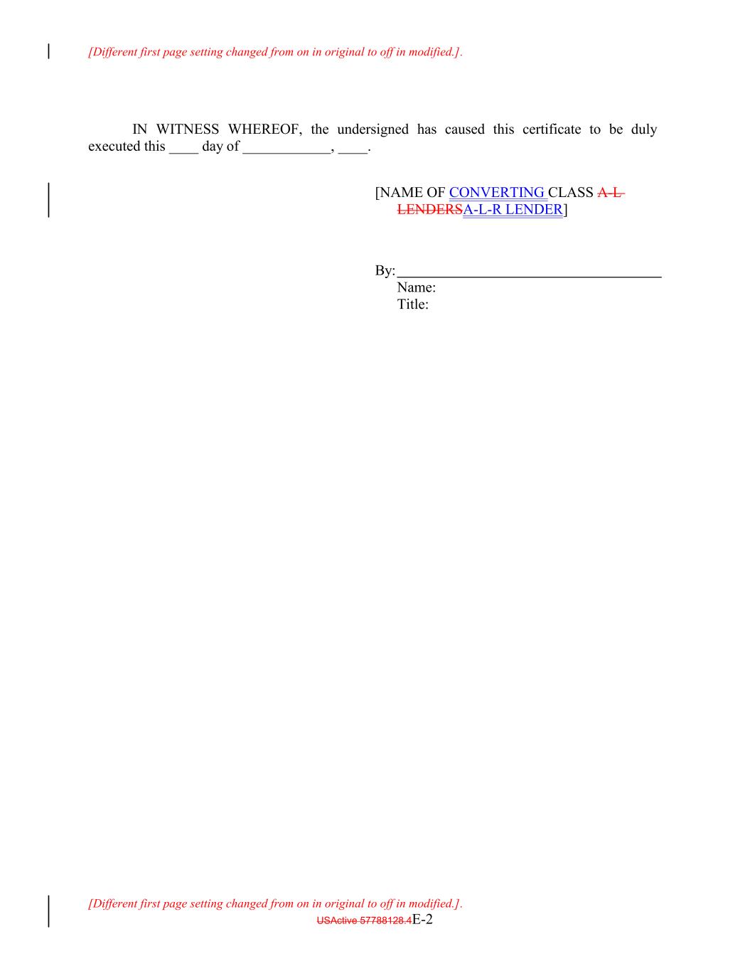 [Different first page setting changed from on in original to off in modified.]. IN WITNESS WHEREOF, the undersigned has caused this certificate to be duly executed this ____ day of ____________, ____. [NAME OF CONVERTING CLASS A-L LENDERSA-L-R LENDER] By: Name: Title: [Different first page setting changed from on in original to off in modified.]. USActive 57788128.4E-2