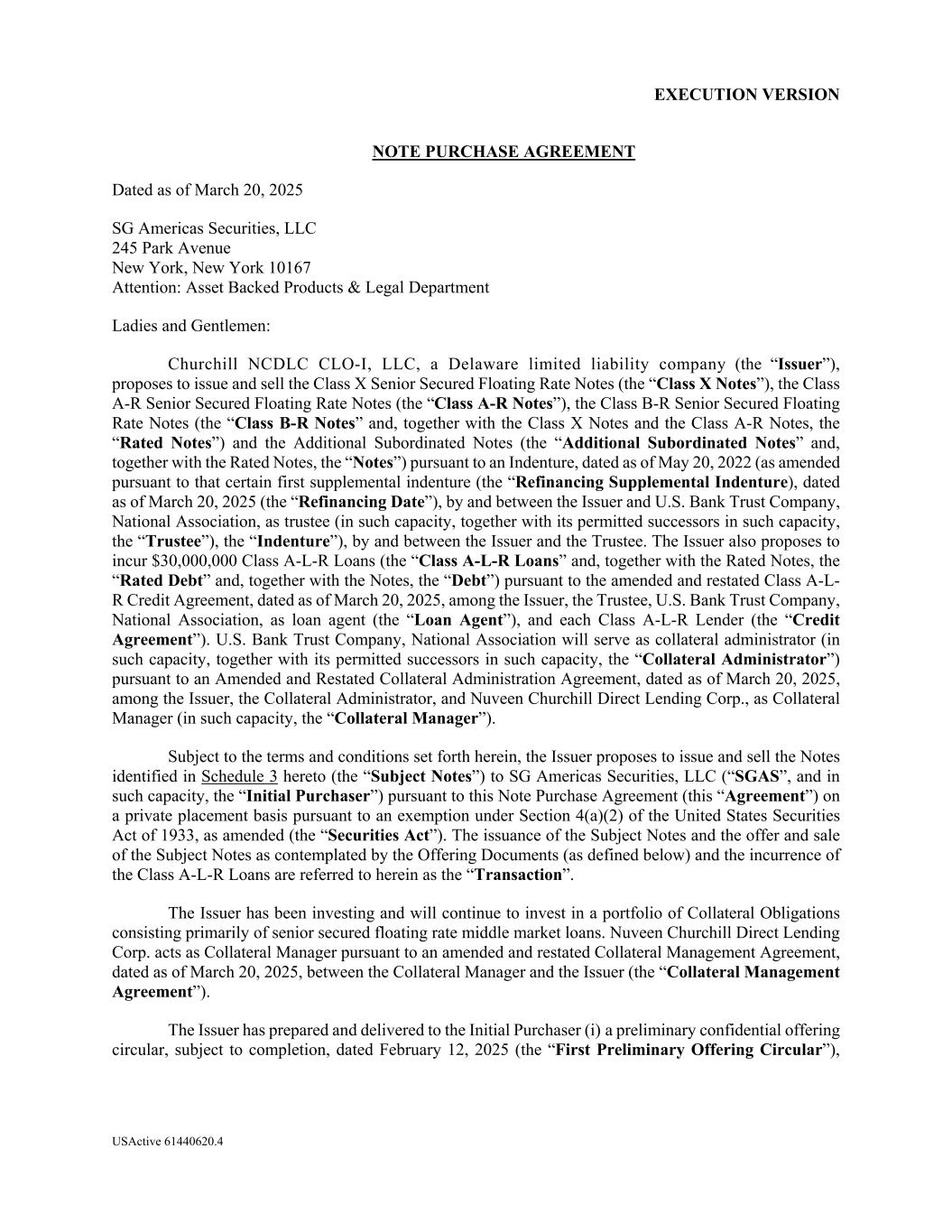 EXECUTION VERSION USActive 61440620.4 NOTE PURCHASE AGREEMENT Dated as of March 20, 2025 SG Americas Securities, LLC 245 Park Avenue New York, New York 10167 Attention: Asset Backed Products & Legal Department Ladies and Gentlemen: Churchill NCDLC CLO-I, LLC, a Delaware limited liability company (the “Issuer”), proposes to issue and sell the Class X Senior Secured Floating Rate Notes (the “Class X Notes”), the Class A-R Senior Secured Floating Rate Notes (the “Class A-R Notes”), the Class B-R Senior Secured Floating Rate Notes (the “Class B-R Notes” and, together with the Class X Notes and the Class A-R Notes, the “Rated Notes”) and the Additional Subordinated Notes (the “Additional Subordinated Notes” and, together with the Rated Notes, the “Notes”) pursuant to an Indenture, dated as of May 20, 2022 (as amended pursuant to that certain first supplemental indenture (the “Refinancing Supplemental Indenture), dated as of March 20, 2025 (the “Refinancing Date”), by and between the Issuer and U.S. Bank Trust Company, National Association, as trustee (in such capacity, together with its permitted successors in such capacity, the “Trustee”), the “Indenture”), by and between the Issuer and the Trustee. The Issuer also proposes to incur $30,000,000 Class A-L-R Loans (the “Class A-L-R Loans” and, together with the Rated Notes, the “Rated Debt” and, together with the Notes, the “Debt”) pursuant to the amended and restated Class A-L- R Credit Agreement, dated as of March 20, 2025, among the Issuer, the Trustee, U.S. Bank Trust Company, National Association, as loan agent (the “Loan Agent”), and each Class A-L-R Lender (the “Credit Agreement”). U.S. Bank Trust Company, National Association will serve as collateral administrator (in such capacity, together with its permitted successors in such capacity, the “Collateral Administrator”) pursuant to an Amended and Restated Collateral Administration Agreement, dated as of March 20, 2025, among the Issuer, the Collateral Administrator, and Nuveen Churchill Direct Lending Corp., as Collateral Manager (in such capacity, the “Collateral Manager”). Subject to the terms and conditions set forth herein, the Issuer proposes to issue and sell the Notes identified in Schedule 3 hereto (the “Subject Notes”) to SG Americas Securities, LLC (“SGAS”, and in such capacity, the “Initial Purchaser”) pursuant to this Note Purchase Agreement (this “Agreement”) on a private placement basis pursuant to an exemption under Section 4(a)(2) of the United States Securities Act of 1933, as amended (the “Securities Act”). The issuance of the Subject Notes and the offer and sale of the Subject Notes as contemplated by the Offering Documents (as defined below) and the incurrence of the Class A-L-R Loans are referred to herein as the “Transaction”. The Issuer has been investing and will continue to invest in a portfolio of Collateral Obligations consisting primarily of senior secured floating rate middle market loans. Nuveen Churchill Direct Lending Corp. acts as Collateral Manager pursuant to an amended and restated Collateral Management Agreement, dated as of March 20, 2025, between the Collateral Manager and the Issuer (the “Collateral Management Agreement”). The Issuer has prepared and delivered to the Initial Purchaser (i) a preliminary confidential offering circular, subject to completion, dated February 12, 2025 (the “First Preliminary Offering Circular”),
