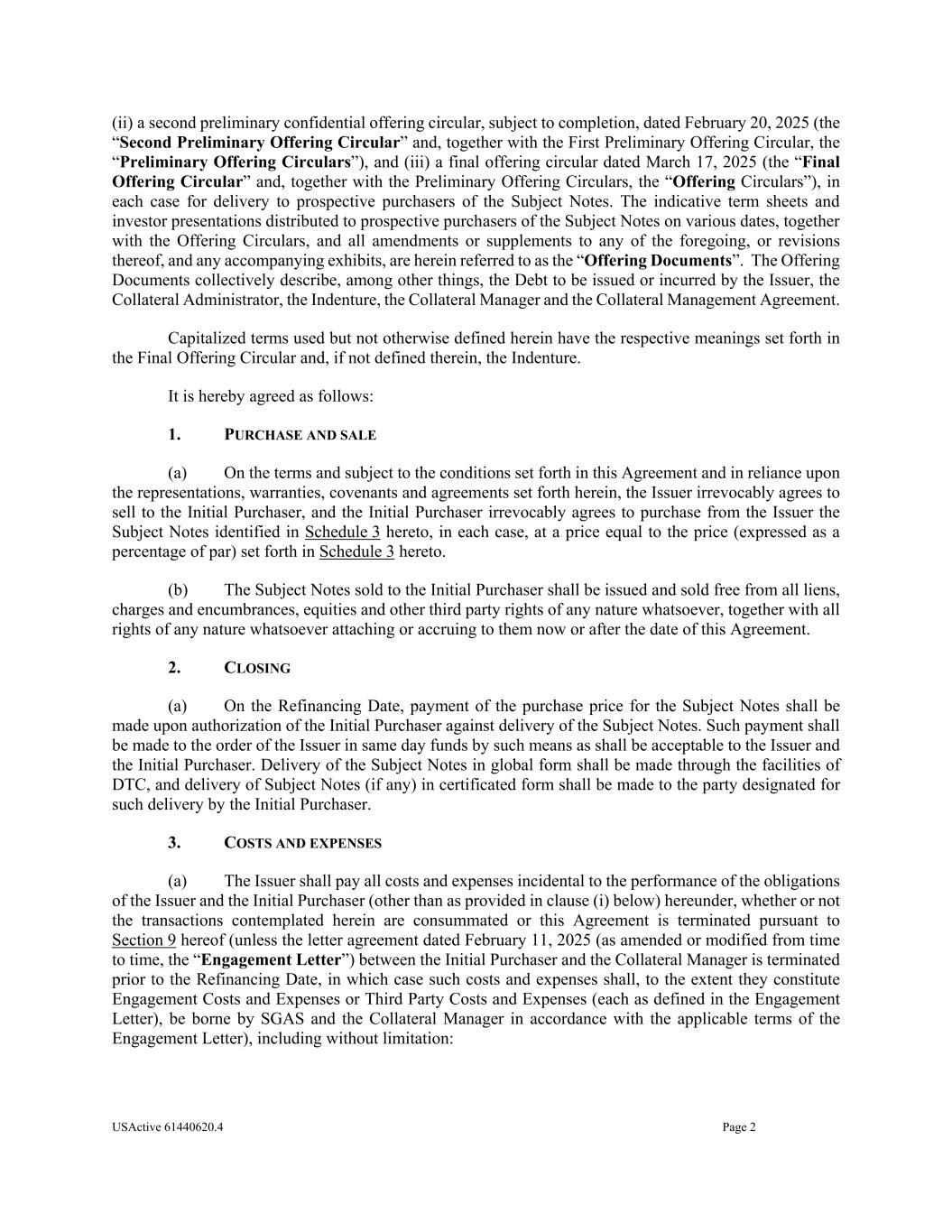 USActive 61440620.4 Page 2 (ii) a second preliminary confidential offering circular, subject to completion, dated February 20, 2025 (the “Second Preliminary Offering Circular” and, together with the First Preliminary Offering Circular, the “Preliminary Offering Circulars”), and (iii) a final offering circular dated March 17, 2025 (the “Final Offering Circular” and, together with the Preliminary Offering Circulars, the “Offering Circulars”), in each case for delivery to prospective purchasers of the Subject Notes. The indicative term sheets and investor presentations distributed to prospective purchasers of the Subject Notes on various dates, together with the Offering Circulars, and all amendments or supplements to any of the foregoing, or revisions thereof, and any accompanying exhibits, are herein referred to as the “Offering Documents”. The Offering Documents collectively describe, among other things, the Debt to be issued or incurred by the Issuer, the Collateral Administrator, the Indenture, the Collateral Manager and the Collateral Management Agreement. Capitalized terms used but not otherwise defined herein have the respective meanings set forth in the Final Offering Circular and, if not defined therein, the Indenture. It is hereby agreed as follows: 1. PURCHASE AND SALE (a) On the terms and subject to the conditions set forth in this Agreement and in reliance upon the representations, warranties, covenants and agreements set forth herein, the Issuer irrevocably agrees to sell to the Initial Purchaser, and the Initial Purchaser irrevocably agrees to purchase from the Issuer the Subject Notes identified in Schedule 3 hereto, in each case, at a price equal to the price (expressed as a percentage of par) set forth in Schedule 3 hereto. (b) The Subject Notes sold to the Initial Purchaser shall be issued and sold free from all liens, charges and encumbrances, equities and other third party rights of any nature whatsoever, together with all rights of any nature whatsoever attaching or accruing to them now or after the date of this Agreement. 2. CLOSING (a) On the Refinancing Date, payment of the purchase price for the Subject Notes shall be made upon authorization of the Initial Purchaser against delivery of the Subject Notes. Such payment shall be made to the order of the Issuer in same day funds by such means as shall be acceptable to the Issuer and the Initial Purchaser. Delivery of the Subject Notes in global form shall be made through the facilities of DTC, and delivery of Subject Notes (if any) in certificated form shall be made to the party designated for such delivery by the Initial Purchaser. 3. COSTS AND EXPENSES (a) The Issuer shall pay all costs and expenses incidental to the performance of the obligations of the Issuer and the Initial Purchaser (other than as provided in clause (i) below) hereunder, whether or not the transactions contemplated herein are consummated or this Agreement is terminated pursuant to Section 9 hereof (unless the letter agreement dated February 11, 2025 (as amended or modified from time to time, the “Engagement Letter”) between the Initial Purchaser and the Collateral Manager is terminated prior to the Refinancing Date, in which case such costs and expenses shall, to the extent they constitute Engagement Costs and Expenses or Third Party Costs and Expenses (each as defined in the Engagement Letter), be borne by SGAS and the Collateral Manager in accordance with the applicable terms of the Engagement Letter), including without limitation: