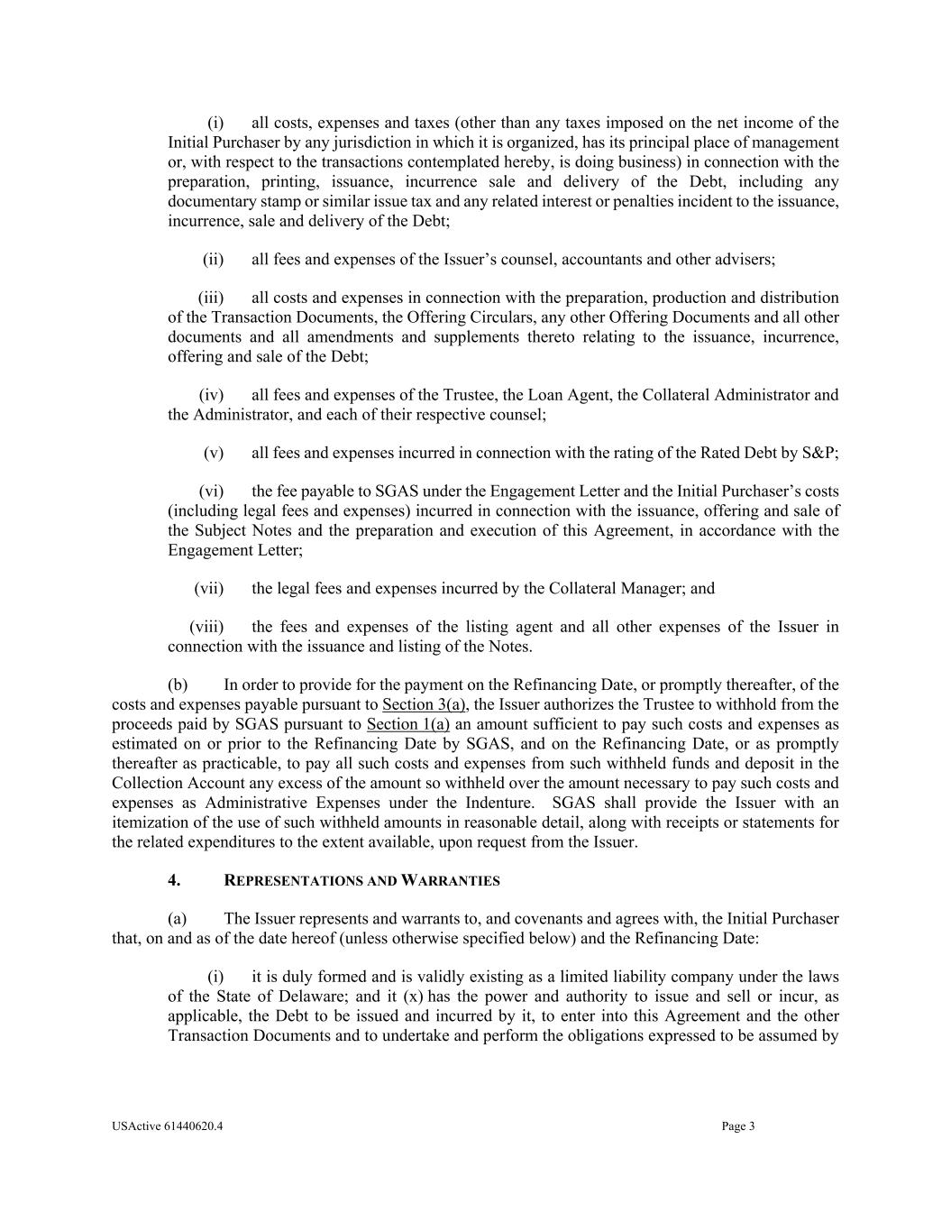 USActive 61440620.4 Page 3 (i) all costs, expenses and taxes (other than any taxes imposed on the net income of the Initial Purchaser by any jurisdiction in which it is organized, has its principal place of management or, with respect to the transactions contemplated hereby, is doing business) in connection with the preparation, printing, issuance, incurrence sale and delivery of the Debt, including any documentary stamp or similar issue tax and any related interest or penalties incident to the issuance, incurrence, sale and delivery of the Debt; (ii) all fees and expenses of the Issuer’s counsel, accountants and other advisers; (iii) all costs and expenses in connection with the preparation, production and distribution of the Transaction Documents, the Offering Circulars, any other Offering Documents and all other documents and all amendments and supplements thereto relating to the issuance, incurrence, offering and sale of the Debt; (iv) all fees and expenses of the Trustee, the Loan Agent, the Collateral Administrator and the Administrator, and each of their respective counsel; (v) all fees and expenses incurred in connection with the rating of the Rated Debt by S&P; (vi) the fee payable to SGAS under the Engagement Letter and the Initial Purchaser’s costs (including legal fees and expenses) incurred in connection with the issuance, offering and sale of the Subject Notes and the preparation and execution of this Agreement, in accordance with the Engagement Letter; (vii) the legal fees and expenses incurred by the Collateral Manager; and (viii) the fees and expenses of the listing agent and all other expenses of the Issuer in connection with the issuance and listing of the Notes. (b) In order to provide for the payment on the Refinancing Date, or promptly thereafter, of the costs and expenses payable pursuant to Section 3(a), the Issuer authorizes the Trustee to withhold from the proceeds paid by SGAS pursuant to Section 1(a) an amount sufficient to pay such costs and expenses as estimated on or prior to the Refinancing Date by SGAS, and on the Refinancing Date, or as promptly thereafter as practicable, to pay all such costs and expenses from such withheld funds and deposit in the Collection Account any excess of the amount so withheld over the amount necessary to pay such costs and expenses as Administrative Expenses under the Indenture. SGAS shall provide the Issuer with an itemization of the use of such withheld amounts in reasonable detail, along with receipts or statements for the related expenditures to the extent available, upon request from the Issuer. 4. REPRESENTATIONS AND WARRANTIES (a) The Issuer represents and warrants to, and covenants and agrees with, the Initial Purchaser that, on and as of the date hereof (unless otherwise specified below) and the Refinancing Date: (i) it is duly formed and is validly existing as a limited liability company under the laws of the State of Delaware; and it (x) has the power and authority to issue and sell or incur, as applicable, the Debt to be issued and incurred by it, to enter into this Agreement and the other Transaction Documents and to undertake and perform the obligations expressed to be assumed by