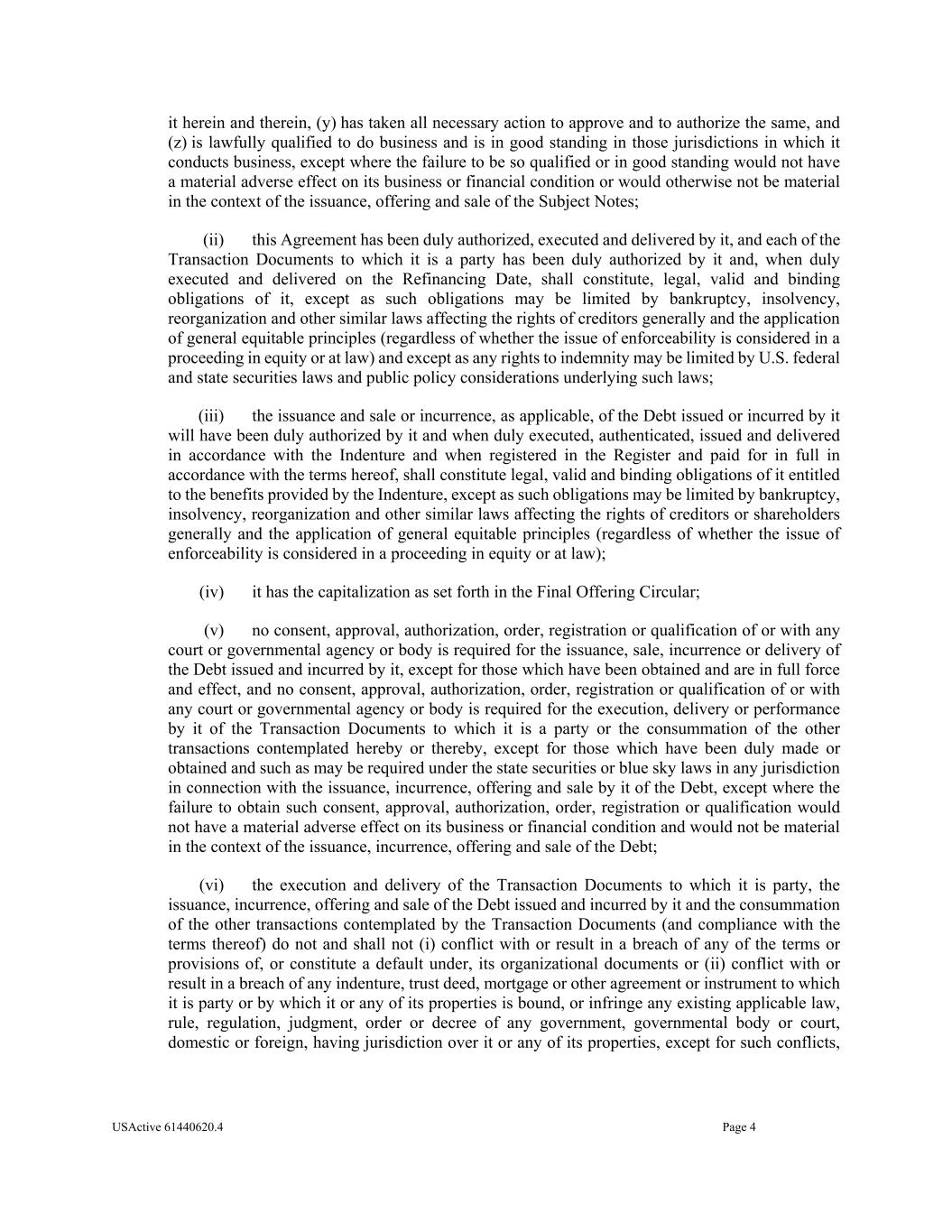 USActive 61440620.4 Page 4 it herein and therein, (y) has taken all necessary action to approve and to authorize the same, and (z) is lawfully qualified to do business and is in good standing in those jurisdictions in which it conducts business, except where the failure to be so qualified or in good standing would not have a material adverse effect on its business or financial condition or would otherwise not be material in the context of the issuance, offering and sale of the Subject Notes; (ii) this Agreement has been duly authorized, executed and delivered by it, and each of the Transaction Documents to which it is a party has been duly authorized by it and, when duly executed and delivered on the Refinancing Date, shall constitute, legal, valid and binding obligations of it, except as such obligations may be limited by bankruptcy, insolvency, reorganization and other similar laws affecting the rights of creditors generally and the application of general equitable principles (regardless of whether the issue of enforceability is considered in a proceeding in equity or at law) and except as any rights to indemnity may be limited by U.S. federal and state securities laws and public policy considerations underlying such laws; (iii) the issuance and sale or incurrence, as applicable, of the Debt issued or incurred by it will have been duly authorized by it and when duly executed, authenticated, issued and delivered in accordance with the Indenture and when registered in the Register and paid for in full in accordance with the terms hereof, shall constitute legal, valid and binding obligations of it entitled to the benefits provided by the Indenture, except as such obligations may be limited by bankruptcy, insolvency, reorganization and other similar laws affecting the rights of creditors or shareholders generally and the application of general equitable principles (regardless of whether the issue of enforceability is considered in a proceeding in equity or at law); (iv) it has the capitalization as set forth in the Final Offering Circular; (v) no consent, approval, authorization, order, registration or qualification of or with any court or governmental agency or body is required for the issuance, sale, incurrence or delivery of the Debt issued and incurred by it, except for those which have been obtained and are in full force and effect, and no consent, approval, authorization, order, registration or qualification of or with any court or governmental agency or body is required for the execution, delivery or performance by it of the Transaction Documents to which it is a party or the consummation of the other transactions contemplated hereby or thereby, except for those which have been duly made or obtained and such as may be required under the state securities or blue sky laws in any jurisdiction in connection with the issuance, incurrence, offering and sale by it of the Debt, except where the failure to obtain such consent, approval, authorization, order, registration or qualification would not have a material adverse effect on its business or financial condition and would not be material in the context of the issuance, incurrence, offering and sale of the Debt; (vi) the execution and delivery of the Transaction Documents to which it is party, the issuance, incurrence, offering and sale of the Debt issued and incurred by it and the consummation of the other transactions contemplated by the Transaction Documents (and compliance with the terms thereof) do not and shall not (i) conflict with or result in a breach of any of the terms or provisions of, or constitute a default under, its organizational documents or (ii) conflict with or result in a breach of any indenture, trust deed, mortgage or other agreement or instrument to which it is party or by which it or any of its properties is bound, or infringe any existing applicable law, rule, regulation, judgment, order or decree of any government, governmental body or court, domestic or foreign, having jurisdiction over it or any of its properties, except for such conflicts,