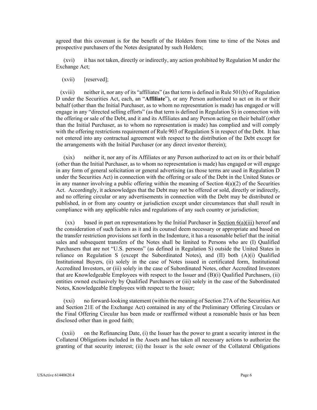 USActive 61440620.4 Page 6 agreed that this covenant is for the benefit of the Holders from time to time of the Notes and prospective purchasers of the Notes designated by such Holders; (xvi) it has not taken, directly or indirectly, any action prohibited by Regulation M under the Exchange Act; (xvii) [reserved]; (xviii) neither it, nor any of its “affiliates” (as that term is defined in Rule 501(b) of Regulation D under the Securities Act, each, an “Affiliate”), or any Person authorized to act on its or their behalf (other than the Initial Purchaser, as to whom no representation is made) has engaged or will engage in any “directed selling efforts” (as that term is defined in Regulation S) in connection with the offering or sale of the Debt, and it and its Affiliates and any Person acting on their behalf (other than the Initial Purchaser, as to whom no representation is made) has complied and will comply with the offering restrictions requirement of Rule 903 of Regulation S in respect of the Debt. It has not entered into any contractual agreement with respect to the distribution of the Debt except for the arrangements with the Initial Purchaser (or any direct investor therein); (xix) neither it, nor any of its Affiliates or any Person authorized to act on its or their behalf (other than the Initial Purchaser, as to whom no representation is made) has engaged or will engage in any form of general solicitation or general advertising (as those terms are used in Regulation D under the Securities Act) in connection with the offering or sale of the Debt in the United States or in any manner involving a public offering within the meaning of Section 4(a)(2) of the Securities Act. Accordingly, it acknowledges that the Debt may not be offered or sold, directly or indirectly, and no offering circular or any advertisements in connection with the Debt may be distributed or published, in or from any country or jurisdiction except under circumstances that shall result in compliance with any applicable rules and regulations of any such country or jurisdiction; (xx) based in part on representations by the Initial Purchaser in Section 6(a)(iii) hereof and the consideration of such factors as it and its counsel deem necessary or appropriate and based on the transfer restriction provisions set forth in the Indenture, it has a reasonable belief that the initial sales and subsequent transfers of the Notes shall be limited to Persons who are (I) Qualified Purchasers that are not “U.S. persons” (as defined in Regulation S) outside the United States in reliance on Regulation S (except the Subordinated Notes), and (II) both (A)(i) Qualified Institutional Buyers, (ii) solely in the case of Notes issued in certificated form, Institutional Accredited Investors, or (iii) solely in the case of Subordinated Notes, other Accredited Investors that are Knowledgeable Employees with respect to the Issuer and (B)(i) Qualified Purchasers, (ii) entities owned exclusively by Qualified Purchasers or (iii) solely in the case of the Subordinated Notes, Knowledgeable Employees with respect to the Issuer; (xxi) no forward-looking statement (within the meaning of Section 27A of the Securities Act and Section 21E of the Exchange Act) contained in any of the Preliminary Offering Circulars or the Final Offering Circular has been made or reaffirmed without a reasonable basis or has been disclosed other than in good faith; (xxii) on the Refinancing Date, (i) the Issuer has the power to grant a security interest in the Collateral Obligations included in the Assets and has taken all necessary actions to authorize the granting of that security interest; (ii) the Issuer is the sole owner of the Collateral Obligations