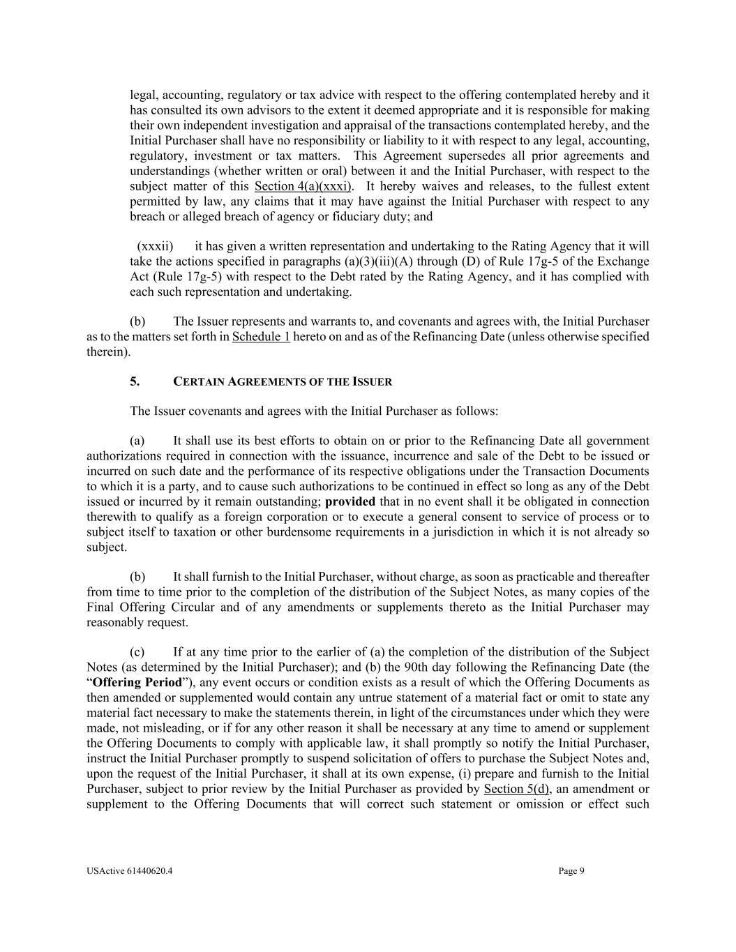 USActive 61440620.4 Page 9 legal, accounting, regulatory or tax advice with respect to the offering contemplated hereby and it has consulted its own advisors to the extent it deemed appropriate and it is responsible for making their own independent investigation and appraisal of the transactions contemplated hereby, and the Initial Purchaser shall have no responsibility or liability to it with respect to any legal, accounting, regulatory, investment or tax matters. This Agreement supersedes all prior agreements and understandings (whether written or oral) between it and the Initial Purchaser, with respect to the subject matter of this Section 4(a)(xxxi). It hereby waives and releases, to the fullest extent permitted by law, any claims that it may have against the Initial Purchaser with respect to any breach or alleged breach of agency or fiduciary duty; and (xxxii) it has given a written representation and undertaking to the Rating Agency that it will take the actions specified in paragraphs (a)(3)(iii)(A) through (D) of Rule 17g-5 of the Exchange Act (Rule 17g-5) with respect to the Debt rated by the Rating Agency, and it has complied with each such representation and undertaking. (b) The Issuer represents and warrants to, and covenants and agrees with, the Initial Purchaser as to the matters set forth in Schedule 1 hereto on and as of the Refinancing Date (unless otherwise specified therein). 5. CERTAIN AGREEMENTS OF THE ISSUER The Issuer covenants and agrees with the Initial Purchaser as follows: (a) It shall use its best efforts to obtain on or prior to the Refinancing Date all government authorizations required in connection with the issuance, incurrence and sale of the Debt to be issued or incurred on such date and the performance of its respective obligations under the Transaction Documents to which it is a party, and to cause such authorizations to be continued in effect so long as any of the Debt issued or incurred by it remain outstanding; provided that in no event shall it be obligated in connection therewith to qualify as a foreign corporation or to execute a general consent to service of process or to subject itself to taxation or other burdensome requirements in a jurisdiction in which it is not already so subject. (b) It shall furnish to the Initial Purchaser, without charge, as soon as practicable and thereafter from time to time prior to the completion of the distribution of the Subject Notes, as many copies of the Final Offering Circular and of any amendments or supplements thereto as the Initial Purchaser may reasonably request. (c) If at any time prior to the earlier of (a) the completion of the distribution of the Subject Notes (as determined by the Initial Purchaser); and (b) the 90th day following the Refinancing Date (the “Offering Period”), any event occurs or condition exists as a result of which the Offering Documents as then amended or supplemented would contain any untrue statement of a material fact or omit to state any material fact necessary to make the statements therein, in light of the circumstances under which they were made, not misleading, or if for any other reason it shall be necessary at any time to amend or supplement the Offering Documents to comply with applicable law, it shall promptly so notify the Initial Purchaser, instruct the Initial Purchaser promptly to suspend solicitation of offers to purchase the Subject Notes and, upon the request of the Initial Purchaser, it shall at its own expense, (i) prepare and furnish to the Initial Purchaser, subject to prior review by the Initial Purchaser as provided by Section 5(d), an amendment or supplement to the Offering Documents that will correct such statement or omission or effect such
