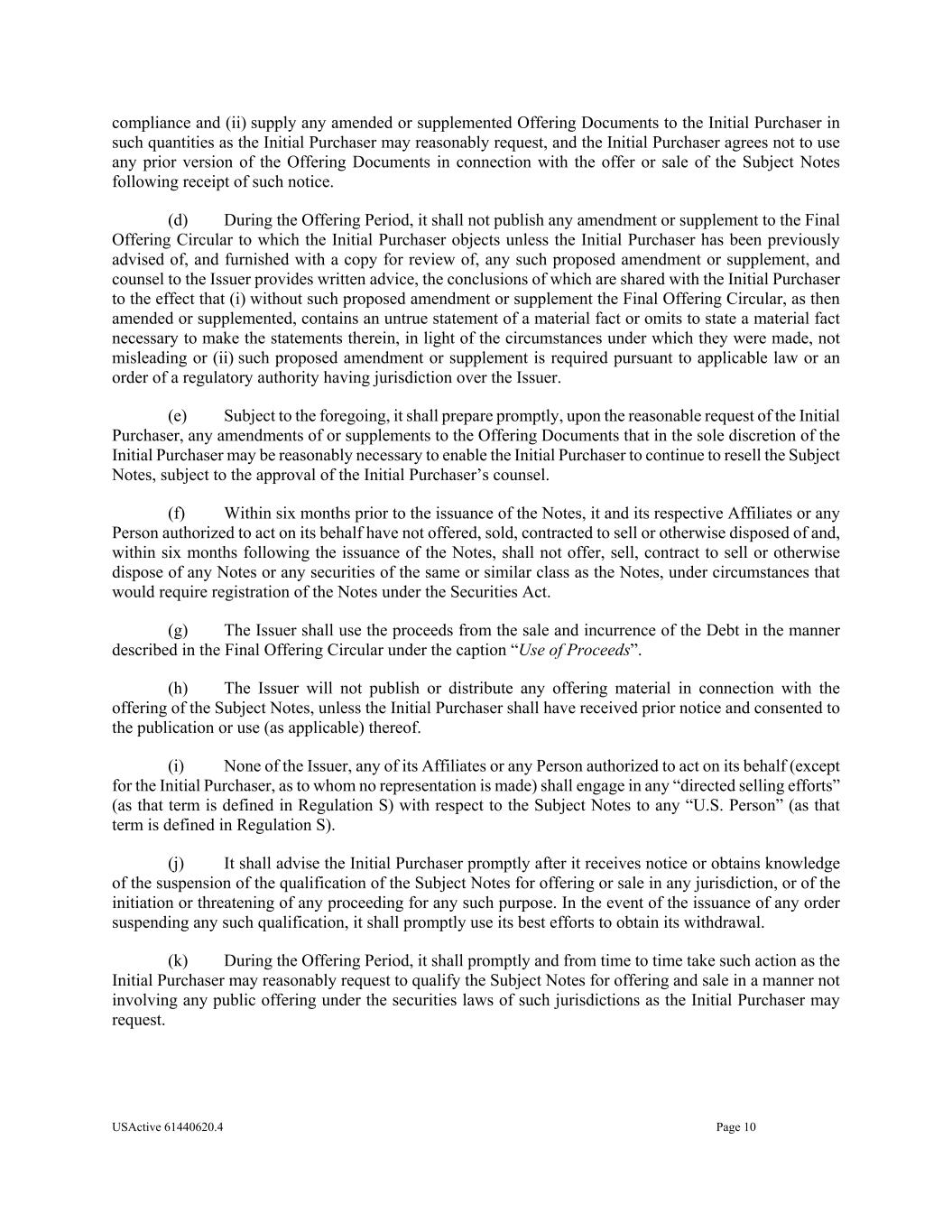 USActive 61440620.4 Page 10 compliance and (ii) supply any amended or supplemented Offering Documents to the Initial Purchaser in such quantities as the Initial Purchaser may reasonably request, and the Initial Purchaser agrees not to use any prior version of the Offering Documents in connection with the offer or sale of the Subject Notes following receipt of such notice. (d) During the Offering Period, it shall not publish any amendment or supplement to the Final Offering Circular to which the Initial Purchaser objects unless the Initial Purchaser has been previously advised of, and furnished with a copy for review of, any such proposed amendment or supplement, and counsel to the Issuer provides written advice, the conclusions of which are shared with the Initial Purchaser to the effect that (i) without such proposed amendment or supplement the Final Offering Circular, as then amended or supplemented, contains an untrue statement of a material fact or omits to state a material fact necessary to make the statements therein, in light of the circumstances under which they were made, not misleading or (ii) such proposed amendment or supplement is required pursuant to applicable law or an order of a regulatory authority having jurisdiction over the Issuer. (e) Subject to the foregoing, it shall prepare promptly, upon the reasonable request of the Initial Purchaser, any amendments of or supplements to the Offering Documents that in the sole discretion of the Initial Purchaser may be reasonably necessary to enable the Initial Purchaser to continue to resell the Subject Notes, subject to the approval of the Initial Purchaser’s counsel. (f) Within six months prior to the issuance of the Notes, it and its respective Affiliates or any Person authorized to act on its behalf have not offered, sold, contracted to sell or otherwise disposed of and, within six months following the issuance of the Notes, shall not offer, sell, contract to sell or otherwise dispose of any Notes or any securities of the same or similar class as the Notes, under circumstances that would require registration of the Notes under the Securities Act. (g) The Issuer shall use the proceeds from the sale and incurrence of the Debt in the manner described in the Final Offering Circular under the caption “Use of Proceeds”. (h) The Issuer will not publish or distribute any offering material in connection with the offering of the Subject Notes, unless the Initial Purchaser shall have received prior notice and consented to the publication or use (as applicable) thereof. (i) None of the Issuer, any of its Affiliates or any Person authorized to act on its behalf (except for the Initial Purchaser, as to whom no representation is made) shall engage in any “directed selling efforts” (as that term is defined in Regulation S) with respect to the Subject Notes to any “U.S. Person” (as that term is defined in Regulation S). (j) It shall advise the Initial Purchaser promptly after it receives notice or obtains knowledge of the suspension of the qualification of the Subject Notes for offering or sale in any jurisdiction, or of the initiation or threatening of any proceeding for any such purpose. In the event of the issuance of any order suspending any such qualification, it shall promptly use its best efforts to obtain its withdrawal. (k) During the Offering Period, it shall promptly and from time to time take such action as the Initial Purchaser may reasonably request to qualify the Subject Notes for offering and sale in a manner not involving any public offering under the securities laws of such jurisdictions as the Initial Purchaser may request.