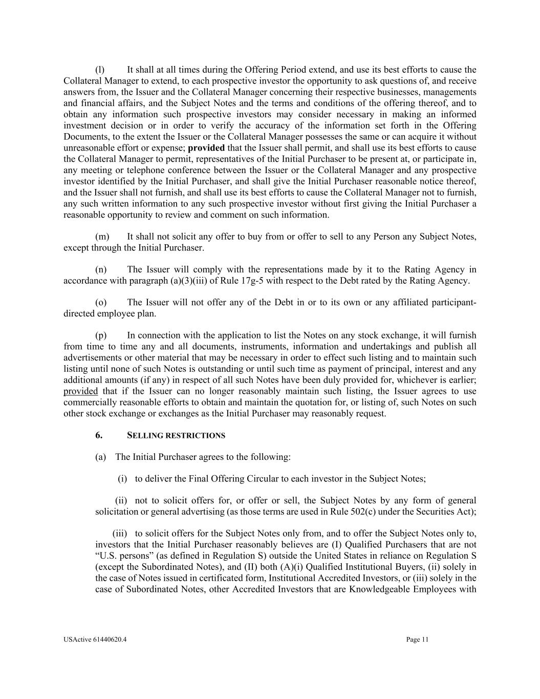 USActive 61440620.4 Page 11 (l) It shall at all times during the Offering Period extend, and use its best efforts to cause the Collateral Manager to extend, to each prospective investor the opportunity to ask questions of, and receive answers from, the Issuer and the Collateral Manager concerning their respective businesses, managements and financial affairs, and the Subject Notes and the terms and conditions of the offering thereof, and to obtain any information such prospective investors may consider necessary in making an informed investment decision or in order to verify the accuracy of the information set forth in the Offering Documents, to the extent the Issuer or the Collateral Manager possesses the same or can acquire it without unreasonable effort or expense; provided that the Issuer shall permit, and shall use its best efforts to cause the Collateral Manager to permit, representatives of the Initial Purchaser to be present at, or participate in, any meeting or telephone conference between the Issuer or the Collateral Manager and any prospective investor identified by the Initial Purchaser, and shall give the Initial Purchaser reasonable notice thereof, and the Issuer shall not furnish, and shall use its best efforts to cause the Collateral Manager not to furnish, any such written information to any such prospective investor without first giving the Initial Purchaser a reasonable opportunity to review and comment on such information. (m) It shall not solicit any offer to buy from or offer to sell to any Person any Subject Notes, except through the Initial Purchaser. (n) The Issuer will comply with the representations made by it to the Rating Agency in accordance with paragraph (a)(3)(iii) of Rule 17g-5 with respect to the Debt rated by the Rating Agency. (o) The Issuer will not offer any of the Debt in or to its own or any affiliated participant- directed employee plan. (p) In connection with the application to list the Notes on any stock exchange, it will furnish from time to time any and all documents, instruments, information and undertakings and publish all advertisements or other material that may be necessary in order to effect such listing and to maintain such listing until none of such Notes is outstanding or until such time as payment of principal, interest and any additional amounts (if any) in respect of all such Notes have been duly provided for, whichever is earlier; provided that if the Issuer can no longer reasonably maintain such listing, the Issuer agrees to use commercially reasonable efforts to obtain and maintain the quotation for, or listing of, such Notes on such other stock exchange or exchanges as the Initial Purchaser may reasonably request. 6. SELLING RESTRICTIONS (a) The Initial Purchaser agrees to the following: (i) to deliver the Final Offering Circular to each investor in the Subject Notes; (ii) not to solicit offers for, or offer or sell, the Subject Notes by any form of general solicitation or general advertising (as those terms are used in Rule 502(c) under the Securities Act); (iii) to solicit offers for the Subject Notes only from, and to offer the Subject Notes only to, investors that the Initial Purchaser reasonably believes are (I) Qualified Purchasers that are not “U.S. persons” (as defined in Regulation S) outside the United States in reliance on Regulation S (except the Subordinated Notes), and (II) both (A)(i) Qualified Institutional Buyers, (ii) solely in the case of Notes issued in certificated form, Institutional Accredited Investors, or (iii) solely in the case of Subordinated Notes, other Accredited Investors that are Knowledgeable Employees with