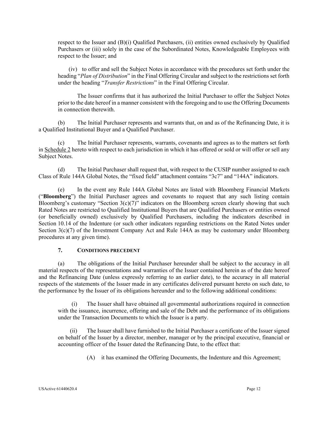 USActive 61440620.4 Page 12 respect to the Issuer and (B)(i) Qualified Purchasers, (ii) entities owned exclusively by Qualified Purchasers or (iii) solely in the case of the Subordinated Notes, Knowledgeable Employees with respect to the Issuer; and (iv) to offer and sell the Subject Notes in accordance with the procedures set forth under the heading “Plan of Distribution” in the Final Offering Circular and subject to the restrictions set forth under the heading “Transfer Restrictions” in the Final Offering Circular. The Issuer confirms that it has authorized the Initial Purchaser to offer the Subject Notes prior to the date hereof in a manner consistent with the foregoing and to use the Offering Documents in connection therewith. (b) The Initial Purchaser represents and warrants that, on and as of the Refinancing Date, it is a Qualified Institutional Buyer and a Qualified Purchaser. (c) The Initial Purchaser represents, warrants, covenants and agrees as to the matters set forth in Schedule 2 hereto with respect to each jurisdiction in which it has offered or sold or will offer or sell any Subject Notes. (d) The Initial Purchaser shall request that, with respect to the CUSIP number assigned to each Class of Rule 144A Global Notes, the “fixed field” attachment contains “3c7” and “144A” indicators. (e) In the event any Rule 144A Global Notes are listed with Bloomberg Financial Markets (“Bloomberg”) the Initial Purchaser agrees and covenants to request that any such listing contain Bloomberg’s customary “Section 3(c)(7)” indicators on the Bloomberg screen clearly showing that such Rated Notes are restricted to Qualified Institutional Buyers that are Qualified Purchasers or entities owned (or beneficially owned) exclusively by Qualified Purchasers, including the indicators described in Section 10.14 of the Indenture (or such other indicators regarding restrictions on the Rated Notes under Section 3(c)(7) of the Investment Company Act and Rule 144A as may be customary under Bloomberg procedures at any given time). 7. CONDITIONS PRECEDENT (a) The obligations of the Initial Purchaser hereunder shall be subject to the accuracy in all material respects of the representations and warranties of the Issuer contained herein as of the date hereof and the Refinancing Date (unless expressly referring to an earlier date), to the accuracy in all material respects of the statements of the Issuer made in any certificates delivered pursuant hereto on such date, to the performance by the Issuer of its obligations hereunder and to the following additional conditions: (i) The Issuer shall have obtained all governmental authorizations required in connection with the issuance, incurrence, offering and sale of the Debt and the performance of its obligations under the Transaction Documents to which the Issuer is a party. (ii) The Issuer shall have furnished to the Initial Purchaser a certificate of the Issuer signed on behalf of the Issuer by a director, member, manager or by the principal executive, financial or accounting officer of the Issuer dated the Refinancing Date, to the effect that: (A) it has examined the Offering Documents, the Indenture and this Agreement;