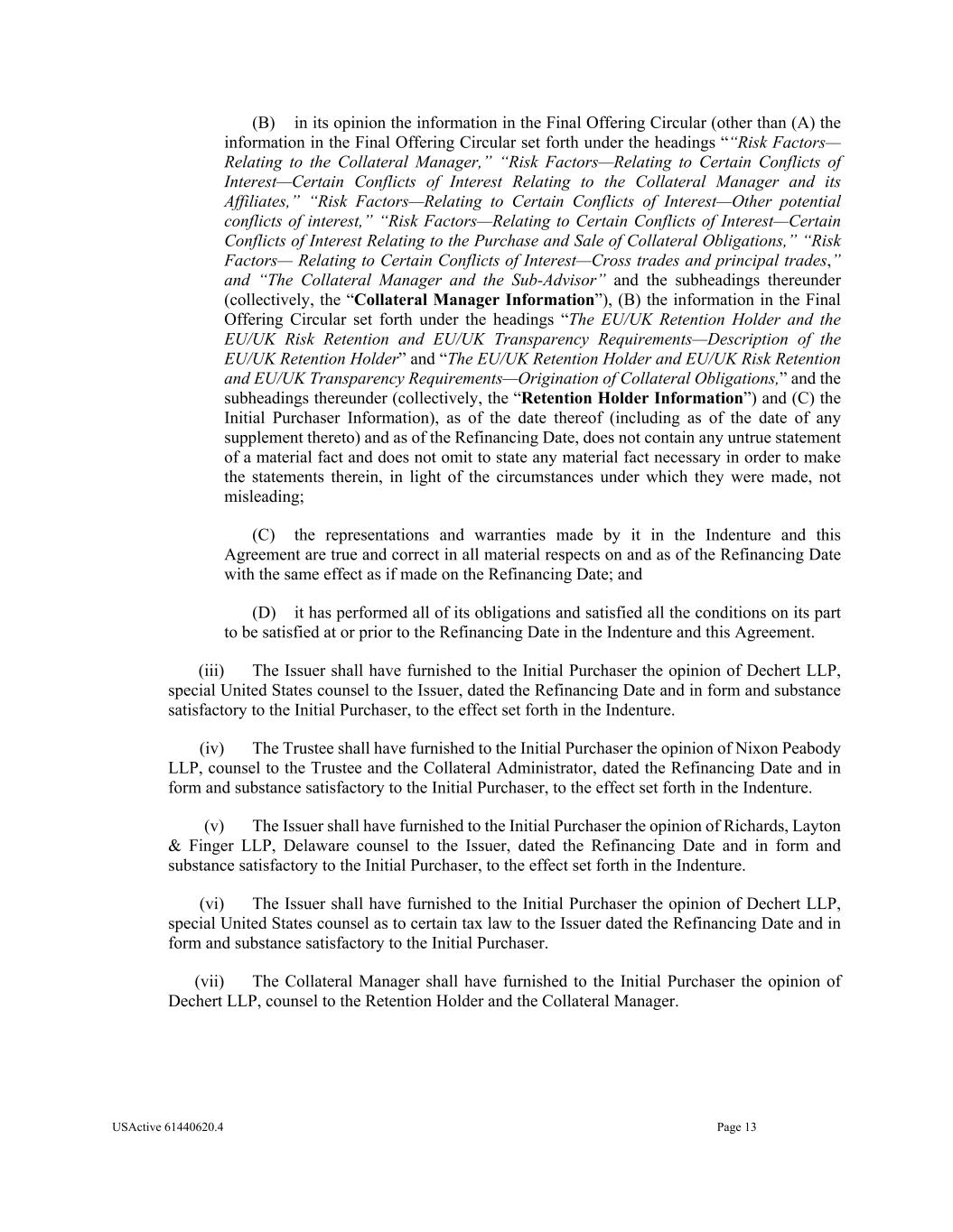 USActive 61440620.4 Page 13 (B) in its opinion the information in the Final Offering Circular (other than (A) the information in the Final Offering Circular set forth under the headings ““Risk Factors— Relating to the Collateral Manager,” “Risk Factors—Relating to Certain Conflicts of Interest—Certain Conflicts of Interest Relating to the Collateral Manager and its Affiliates,” “Risk Factors—Relating to Certain Conflicts of Interest—Other potential conflicts of interest,” “Risk Factors—Relating to Certain Conflicts of Interest—Certain Conflicts of Interest Relating to the Purchase and Sale of Collateral Obligations,” “Risk Factors— Relating to Certain Conflicts of Interest—Cross trades and principal trades,” and “The Collateral Manager and the Sub-Advisor” and the subheadings thereunder (collectively, the “Collateral Manager Information”), (B) the information in the Final Offering Circular set forth under the headings “The EU/UK Retention Holder and the EU/UK Risk Retention and EU/UK Transparency Requirements—Description of the EU/UK Retention Holder” and “The EU/UK Retention Holder and EU/UK Risk Retention and EU/UK Transparency Requirements—Origination of Collateral Obligations,” and the subheadings thereunder (collectively, the “Retention Holder Information”) and (C) the Initial Purchaser Information), as of the date thereof (including as of the date of any supplement thereto) and as of the Refinancing Date, does not contain any untrue statement of a material fact and does not omit to state any material fact necessary in order to make the statements therein, in light of the circumstances under which they were made, not misleading; (C) the representations and warranties made by it in the Indenture and this Agreement are true and correct in all material respects on and as of the Refinancing Date with the same effect as if made on the Refinancing Date; and (D) it has performed all of its obligations and satisfied all the conditions on its part to be satisfied at or prior to the Refinancing Date in the Indenture and this Agreement. (iii) The Issuer shall have furnished to the Initial Purchaser the opinion of Dechert LLP, special United States counsel to the Issuer, dated the Refinancing Date and in form and substance satisfactory to the Initial Purchaser, to the effect set forth in the Indenture. (iv) The Trustee shall have furnished to the Initial Purchaser the opinion of Nixon Peabody LLP, counsel to the Trustee and the Collateral Administrator, dated the Refinancing Date and in form and substance satisfactory to the Initial Purchaser, to the effect set forth in the Indenture. (v) The Issuer shall have furnished to the Initial Purchaser the opinion of Richards, Layton & Finger LLP, Delaware counsel to the Issuer, dated the Refinancing Date and in form and substance satisfactory to the Initial Purchaser, to the effect set forth in the Indenture. (vi) The Issuer shall have furnished to the Initial Purchaser the opinion of Dechert LLP, special United States counsel as to certain tax law to the Issuer dated the Refinancing Date and in form and substance satisfactory to the Initial Purchaser. (vii) The Collateral Manager shall have furnished to the Initial Purchaser the opinion of Dechert LLP, counsel to the Retention Holder and the Collateral Manager.