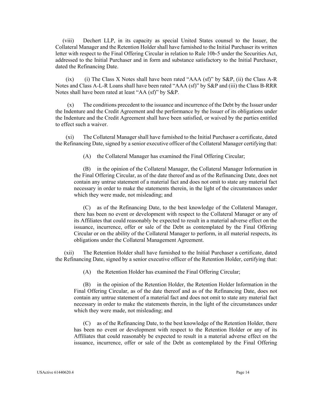 USActive 61440620.4 Page 14 (viii) Dechert LLP, in its capacity as special United States counsel to the Issuer, the Collateral Manager and the Retention Holder shall have furnished to the Initial Purchaser its written letter with respect to the Final Offering Circular in relation to Rule 10b-5 under the Securities Act, addressed to the Initial Purchaser and in form and substance satisfactory to the Initial Purchaser, dated the Refinancing Date. (ix) (i) The Class X Notes shall have been rated “AAA (sf)” by S&P, (ii) the Class A-R Notes and Class A-L-R Loans shall have been rated “AAA (sf)” by S&P and (iii) the Class B-RRR Notes shall have been rated at least “AA (sf)” by S&P. (x) The conditions precedent to the issuance and incurrence of the Debt by the Issuer under the Indenture and the Credit Agreement and the performance by the Issuer of its obligations under the Indenture and the Credit Agreement shall have been satisfied, or waived by the parties entitled to effect such a waiver. (xi) The Collateral Manager shall have furnished to the Initial Purchaser a certificate, dated the Refinancing Date, signed by a senior executive officer of the Collateral Manager certifying that: (A) the Collateral Manager has examined the Final Offering Circular; (B) in the opinion of the Collateral Manager, the Collateral Manager Information in the Final Offering Circular, as of the date thereof and as of the Refinancing Date, does not contain any untrue statement of a material fact and does not omit to state any material fact necessary in order to make the statements therein, in the light of the circumstances under which they were made, not misleading; and (C) as of the Refinancing Date, to the best knowledge of the Collateral Manager, there has been no event or development with respect to the Collateral Manager or any of its Affiliates that could reasonably be expected to result in a material adverse effect on the issuance, incurrence, offer or sale of the Debt as contemplated by the Final Offering Circular or on the ability of the Collateral Manager to perform, in all material respects, its obligations under the Collateral Management Agreement. (xii) The Retention Holder shall have furnished to the Initial Purchaser a certificate, dated the Refinancing Date, signed by a senior executive officer of the Retention Holder, certifying that: (A) the Retention Holder has examined the Final Offering Circular; (B) in the opinion of the Retention Holder, the Retention Holder Information in the Final Offering Circular, as of the date thereof and as of the Refinancing Date, does not contain any untrue statement of a material fact and does not omit to state any material fact necessary in order to make the statements therein, in the light of the circumstances under which they were made, not misleading; and (C) as of the Refinancing Date, to the best knowledge of the Retention Holder, there has been no event or development with respect to the Retention Holder or any of its Affiliates that could reasonably be expected to result in a material adverse effect on the issuance, incurrence, offer or sale of the Debt as contemplated by the Final Offering